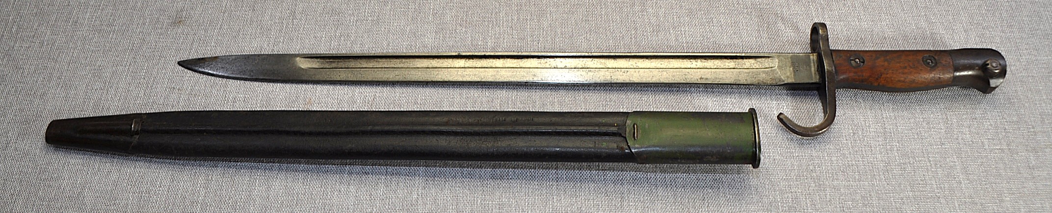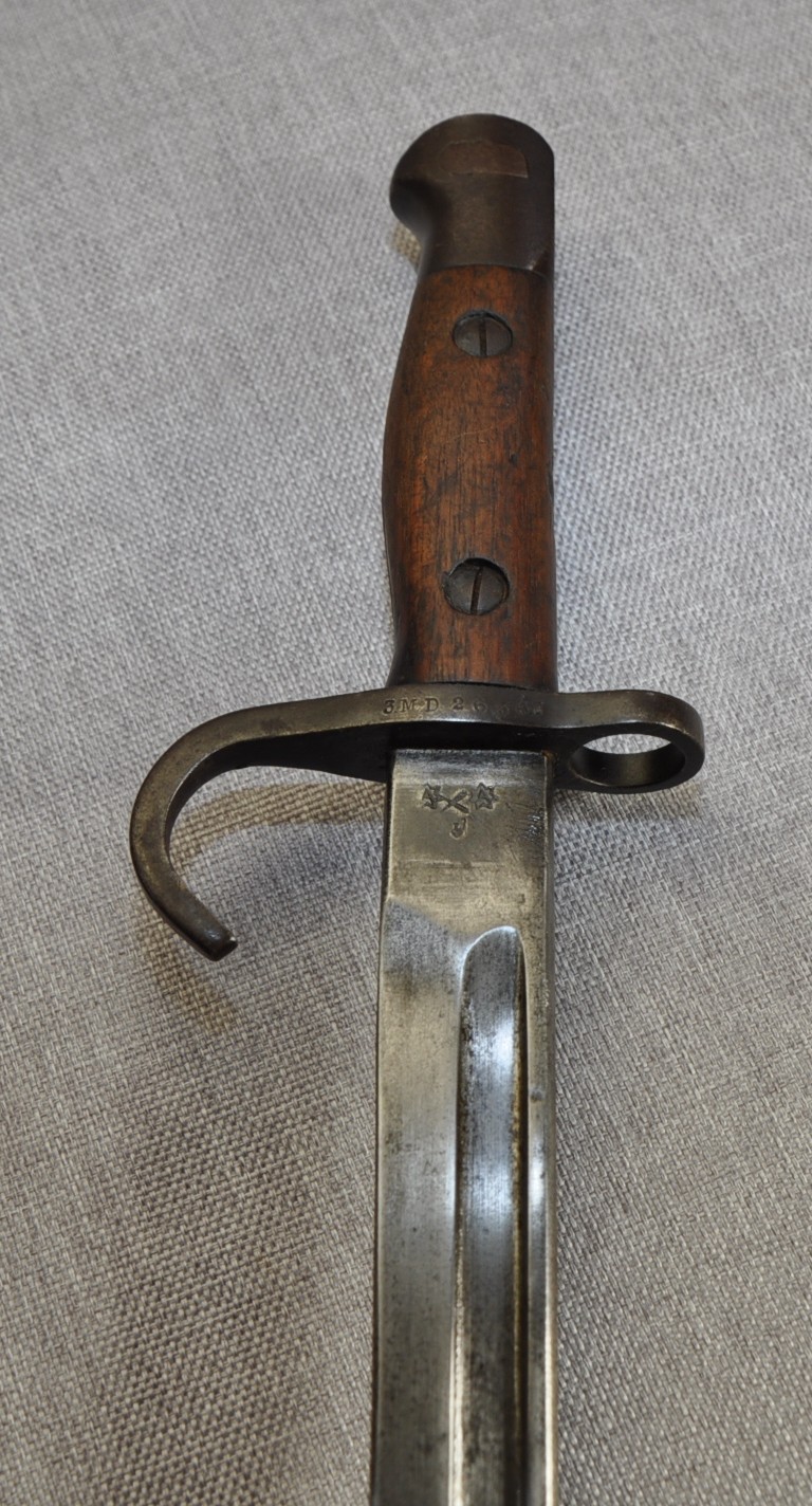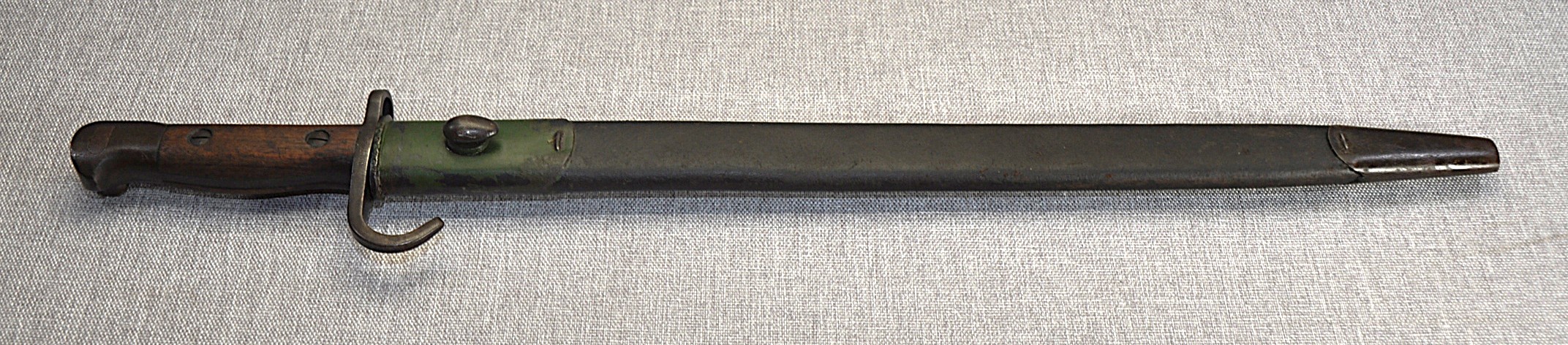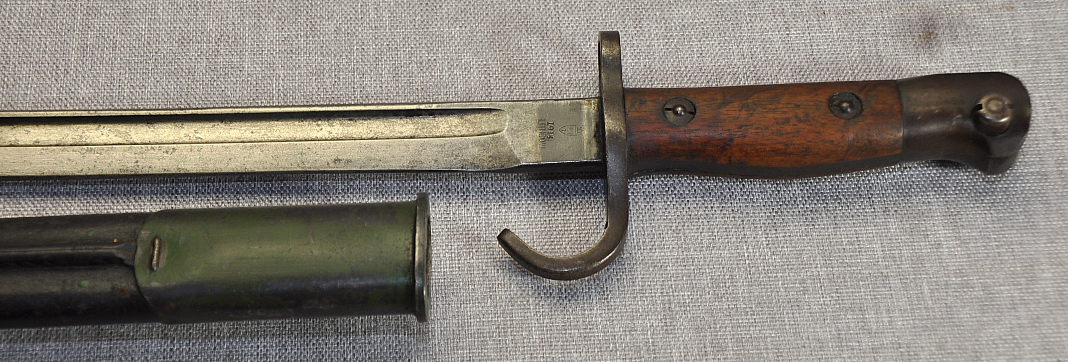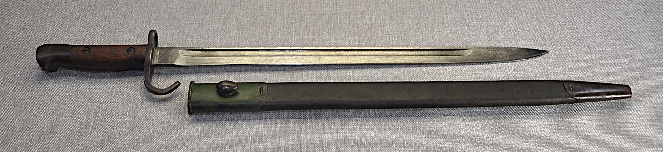Australian Pattern 1907 bayonet with hooked quillon manufactured at Lithgow and dated 1914. This bayonet was issued early in 1914 prior to some moulding changes and has the typical proof marks on one side of the blade/ricasso and the clear marking “LITHGOW” and date (1914) on the other side of ricasso. The bayonet was issued to the Third Military District (Victoria) and is marked 3MD26367 to the crossguard. The scabbard is the early style with the teardrop frog stud, figured locket and chape, the chape has the proof mark of the A inside the 6 pointed star. The locket is green painted and has the marking to the mouth lip to a Military District. It clearly shows “MD” but the numbers are indiscypherable due mainly to their size. The scabbard is dated 1915 with the rear of the leather stamped with the word LITHGOW followed by the “A in the star” followed by the date 1915.