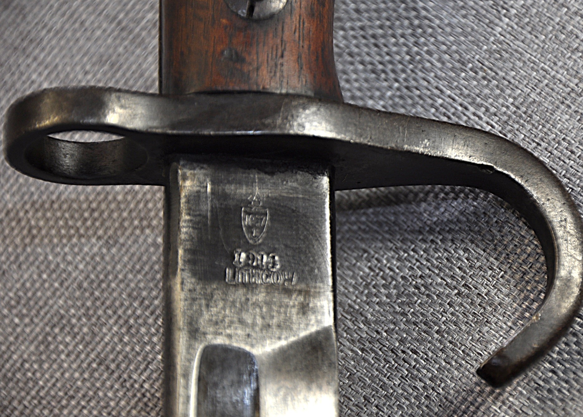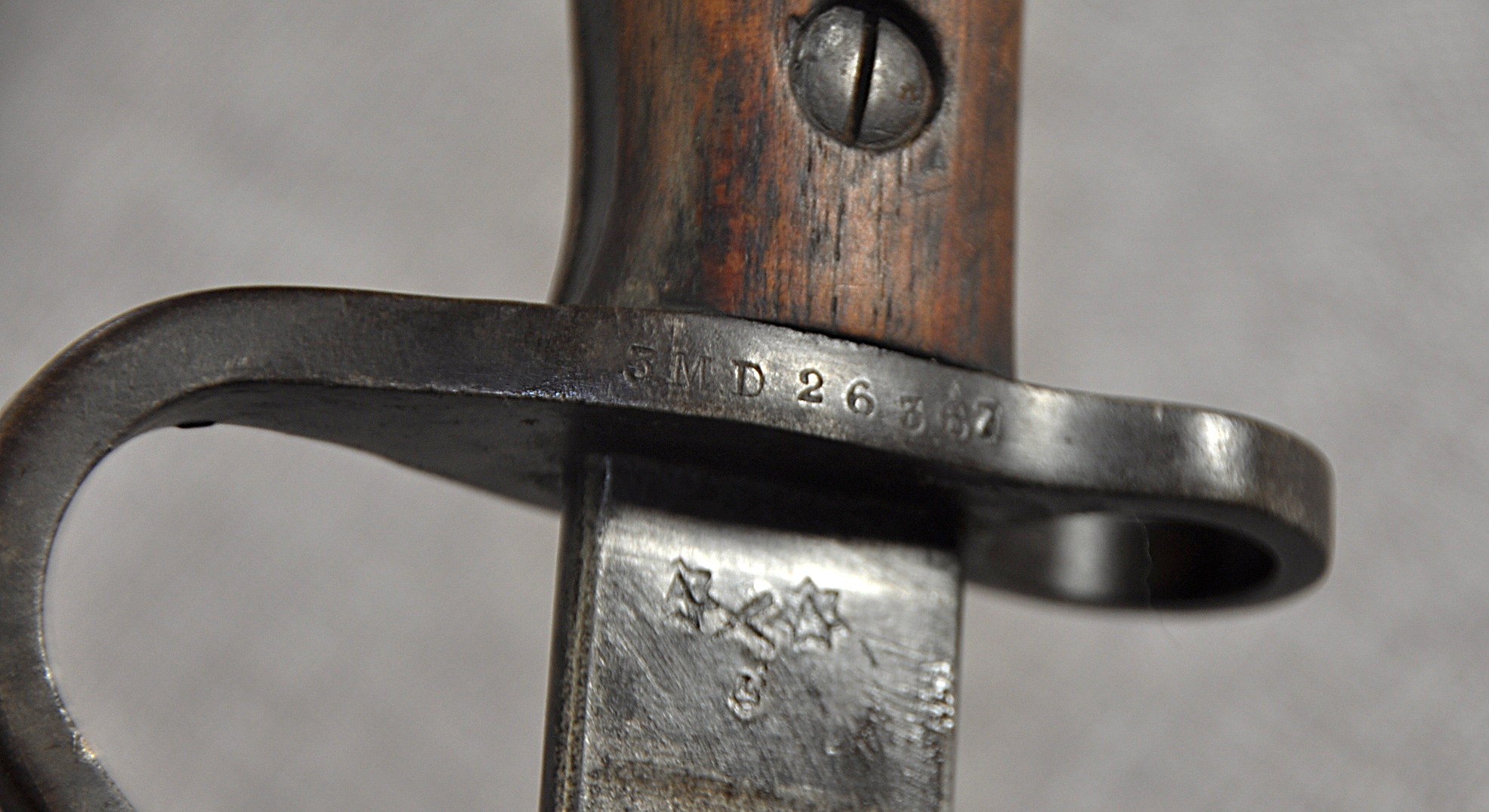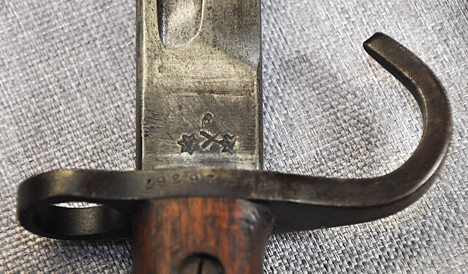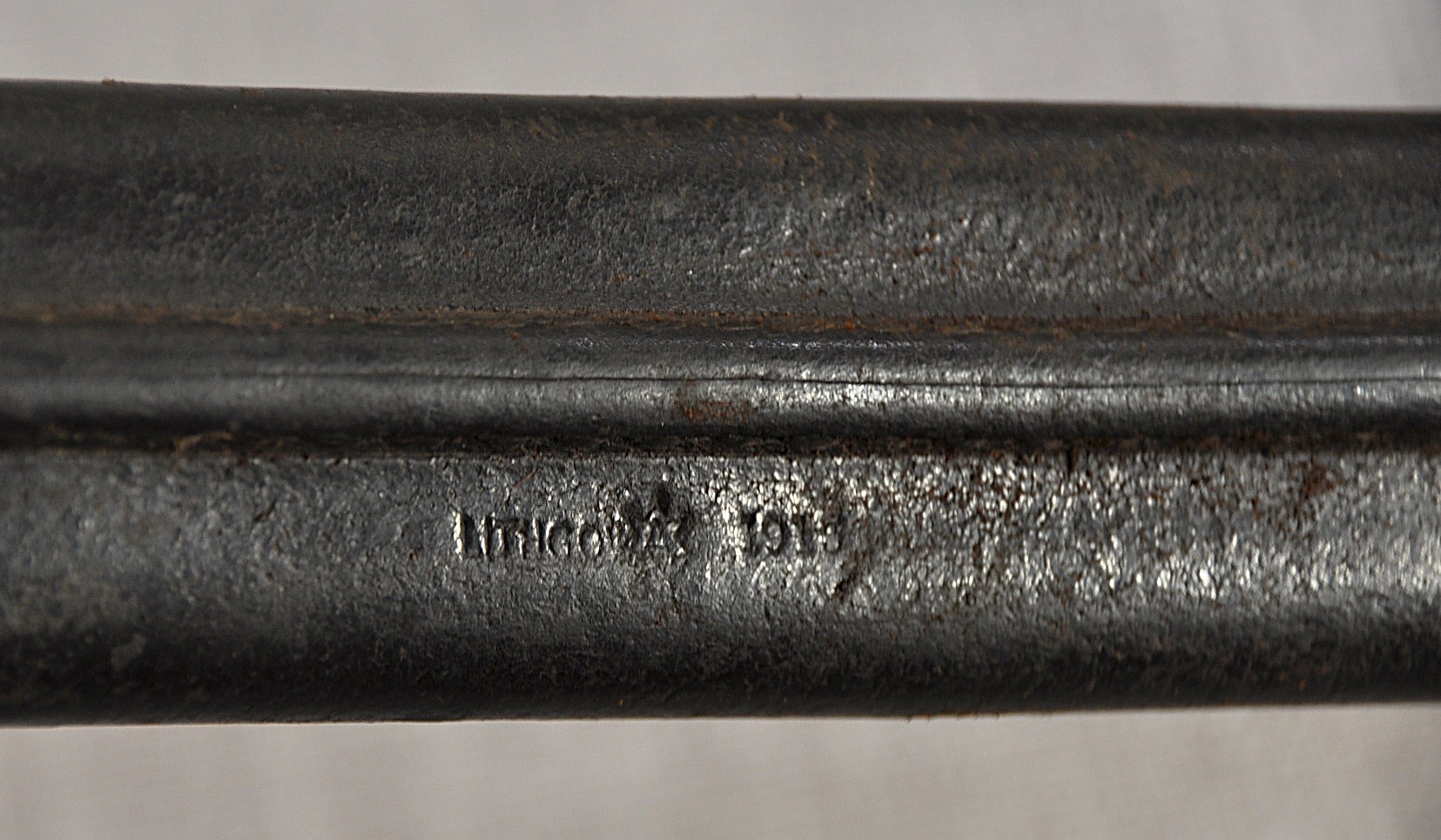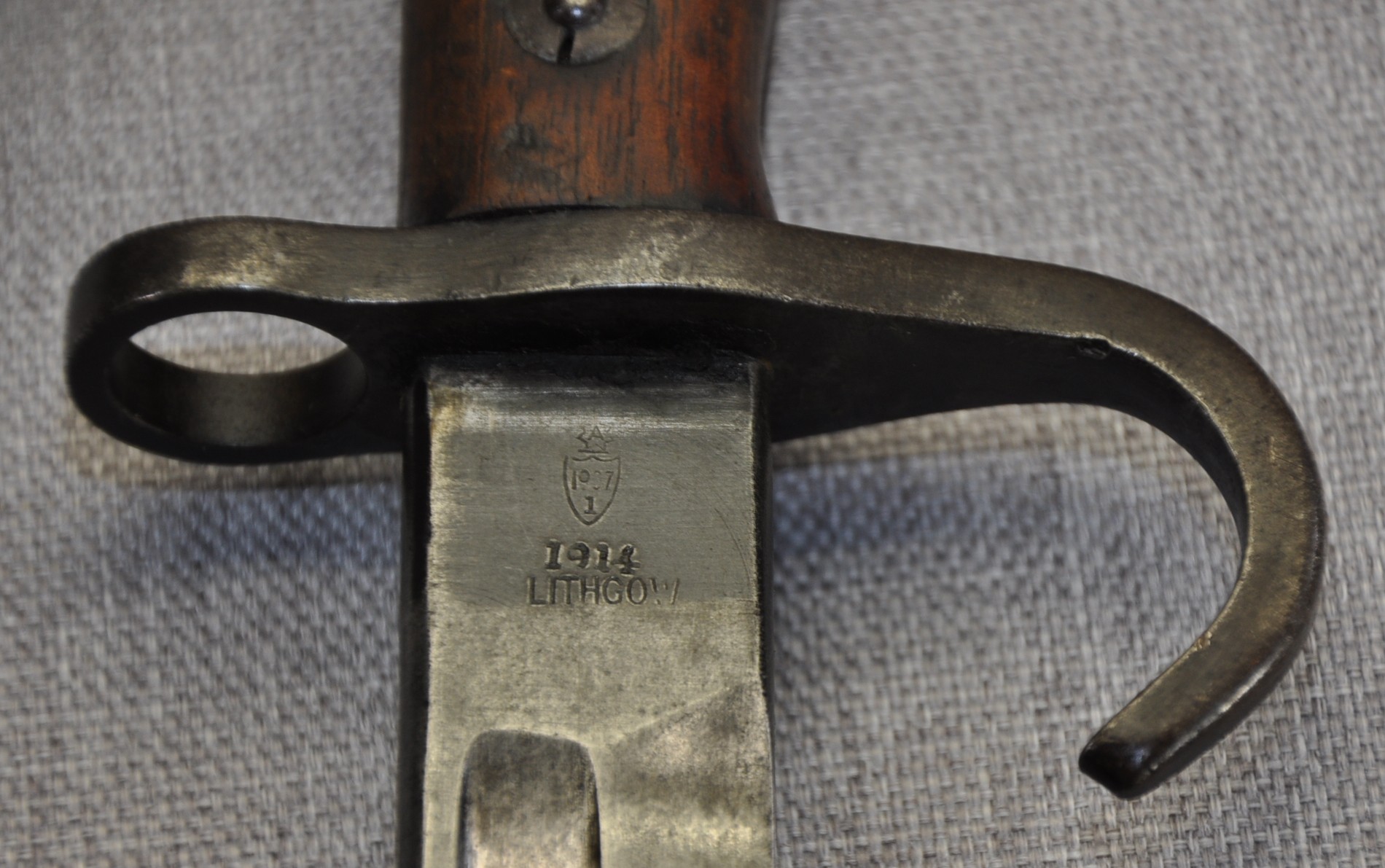 Australian Pattern 1907 bayonet with hooked quillon manufactured at Lithgow and dated 1914. This bayonet was issued early in 1914 prior to some moulding changes and has the typical proof marks on one side of the blade/ricasso and the clear marking “LITHGOW” and date (1914) on the other side of ricasso. The bayonet was issued to the Third Military District (Victoria) and is marked 3MD26367 to the crossguard. The scabbard is the early style with the teardrop frog stud, figured locket and chape, the chape has the proof mark of the A inside the 6 pointed star. The locket is green painted and has the marking to the mouth lip to a Military District. It clearly shows “MD” but the numbers are indiscypherable due mainly to their size. The scabbard is dated 1915 with the rear of the leather stamped with the word LITHGOW followed by the “A in the star” followed by the date 1915.