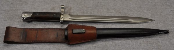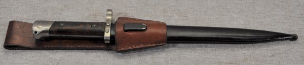 Austrian Model 1895 knife bayonet for the Mannlicher rifle. The refurbished or CONVERSION from NCO pattern with the hook quillion removed and new crossguard fitted and secured by two large domed rivets and engraved with serial number “3966”. Bayonet is a single-edged inverted blade rounded fullers and is marked OE over WG to ricasso with the Imperial eagle to the reverse side. Wood grips replaced with dark wood and secured by dome rivets and washers. Scabbard is painted black without any markings and with a light brown frog. (reference TTH #58)