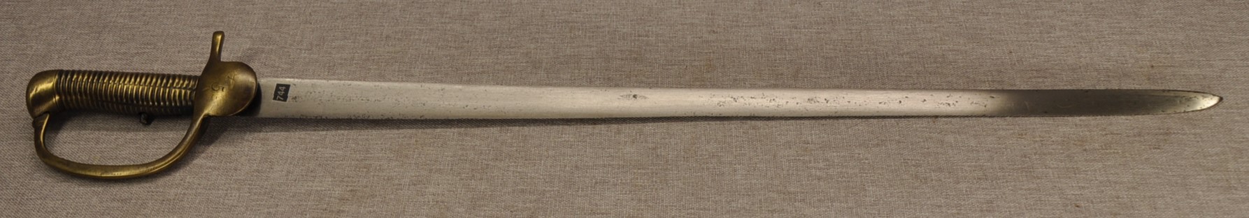 British Pattern 1801 2nd Model Baker sword bayonet circa 1805 until 1815 with the rounded “D” shaped knuckle guard. Would be classified as a Volunteer pattern due to the width of the blade and has no ordnance or manufacturers’ markings. Engraved number “5” to the crossguard shell. The unfullered blade has been cleaned. Whilst in quite good condition the locking latch is working but frail and shows old pitting. No scabbard. (reference WW670 and BCB B85) – SOLD 2025