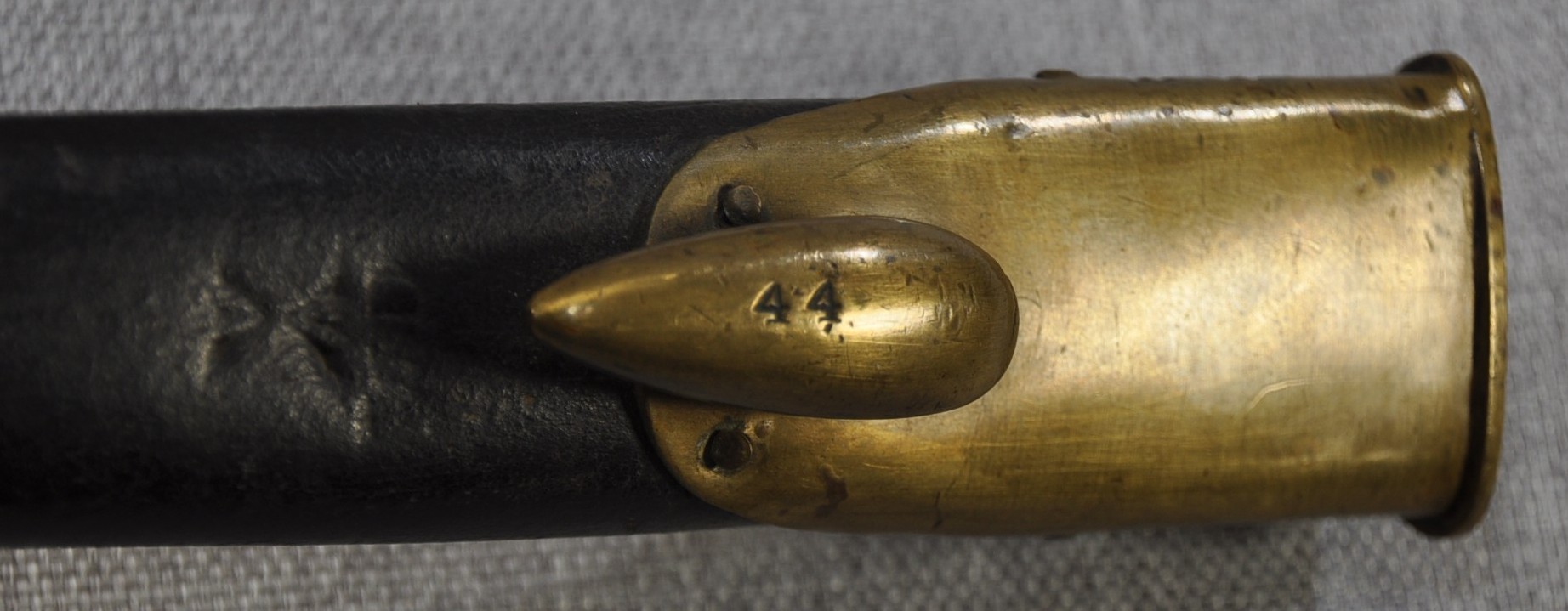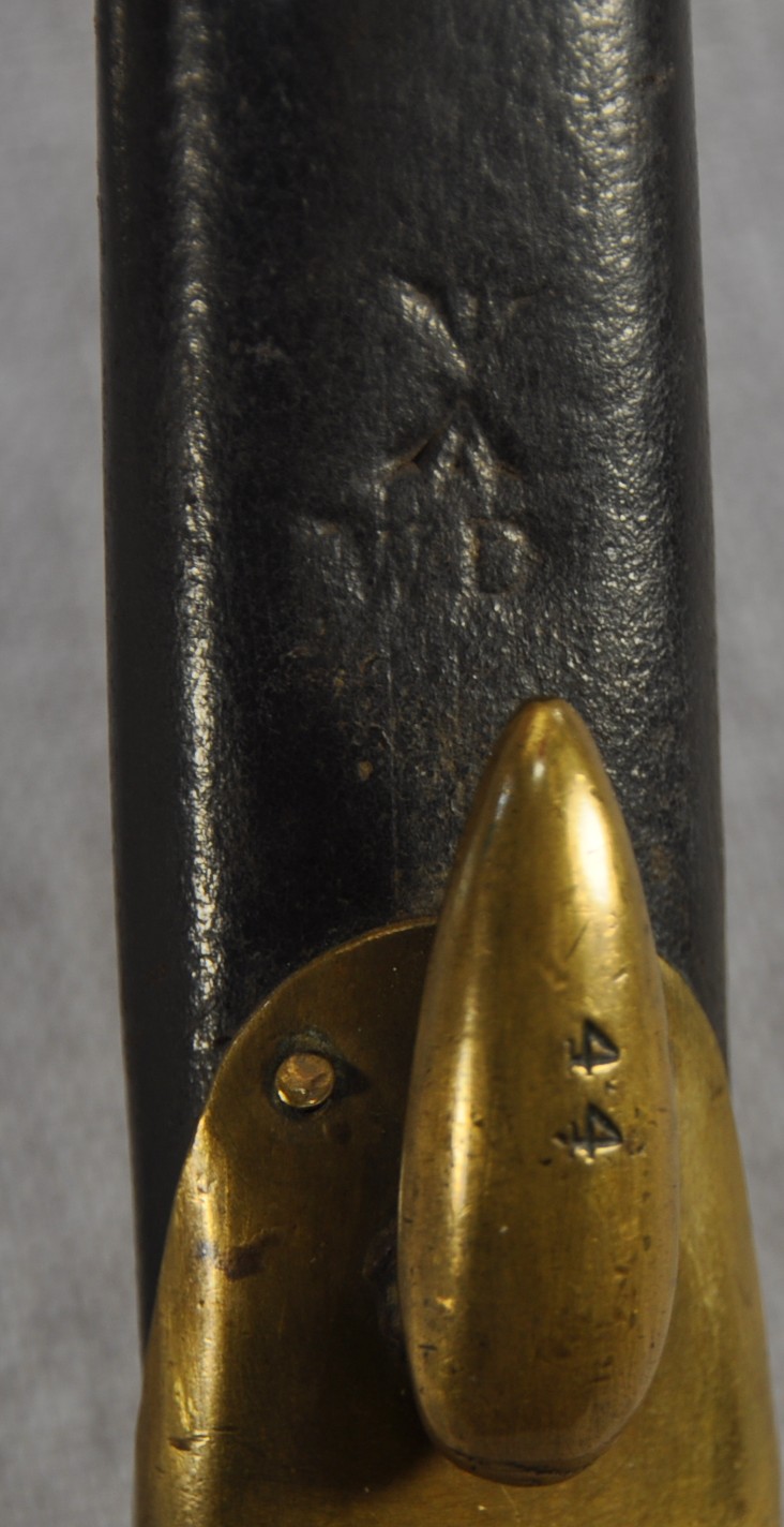 Scabbard is Pattern 1853 LATE TYPE, POST 1866, black leather with brass locket and chape. Sitching is excellent and leather marked with broad arrows and WD. “44” stamped on frog stud.