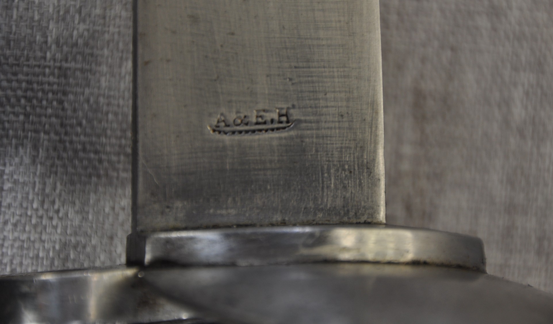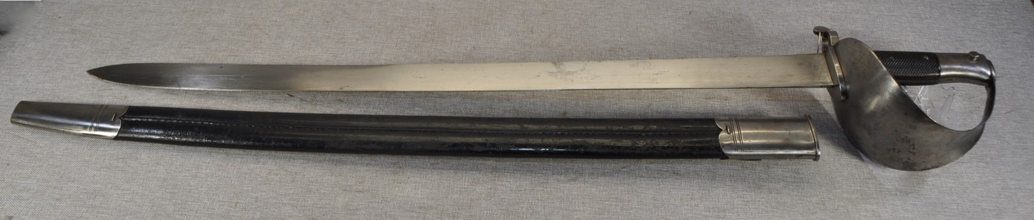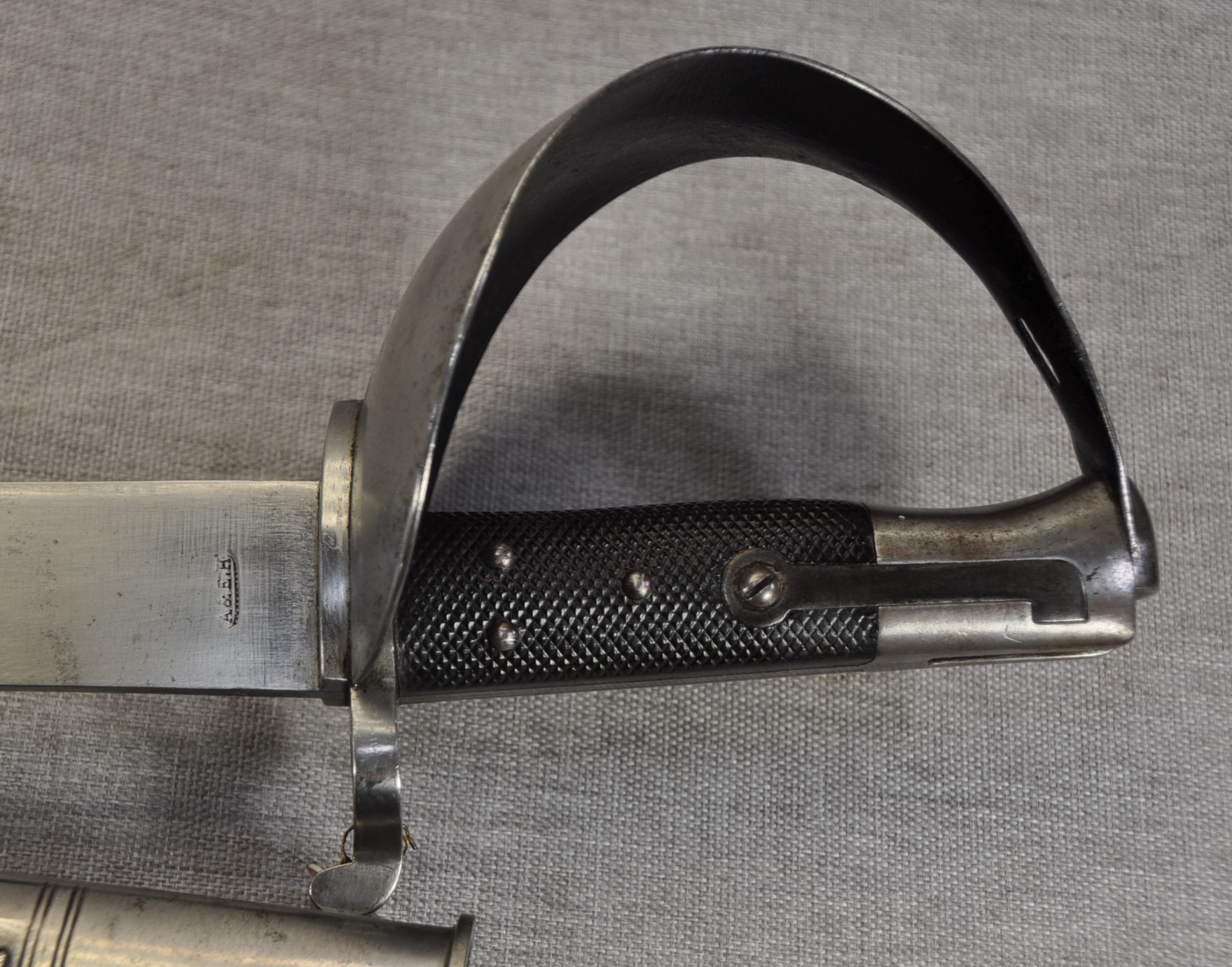 British Pattern 1859 Cutlass bayonet with leather grips bushed for the Martini Henry rifle. Manufactured c1886 by A & E HORSTER, in SOLINGEN, GERMANY. Manufacturers logo to ricasso on one side and the Soligen inspection mark “Crown over S over 14” on the other. Scabbard is black lather with steel locket and chape. Overall length is 826mm, Blade length 680mm and with MR 18mm. Originally part of the John Watts Collection.  Bayonet and scabbard in excellent condition overall. (Reference WW 765 and B&CB B193)