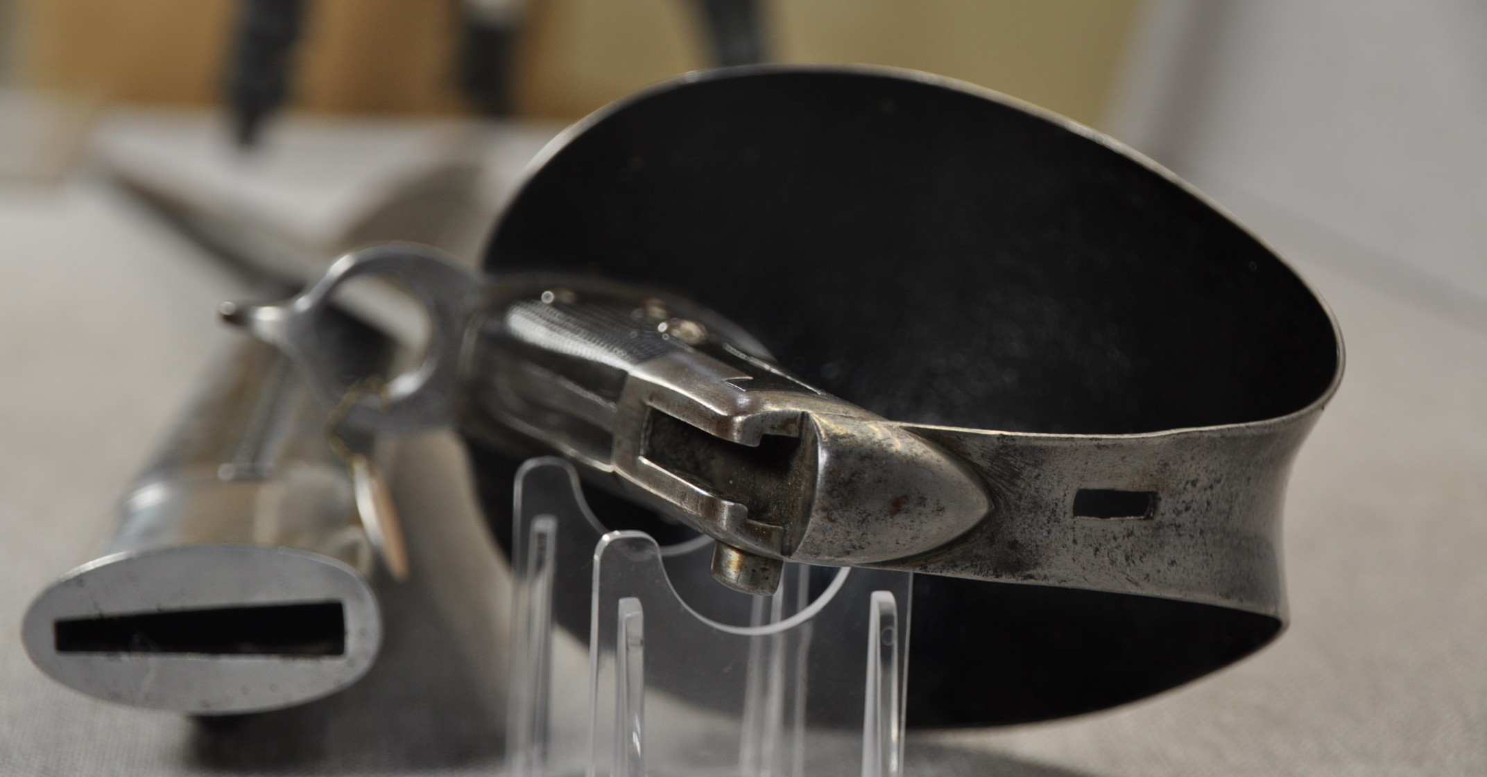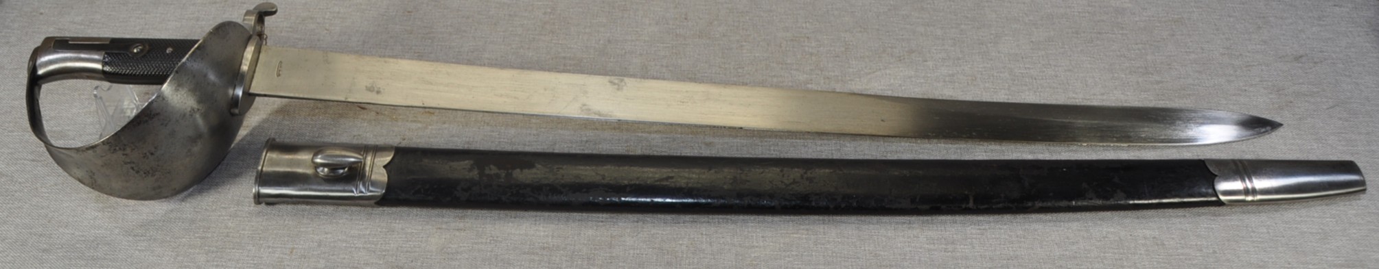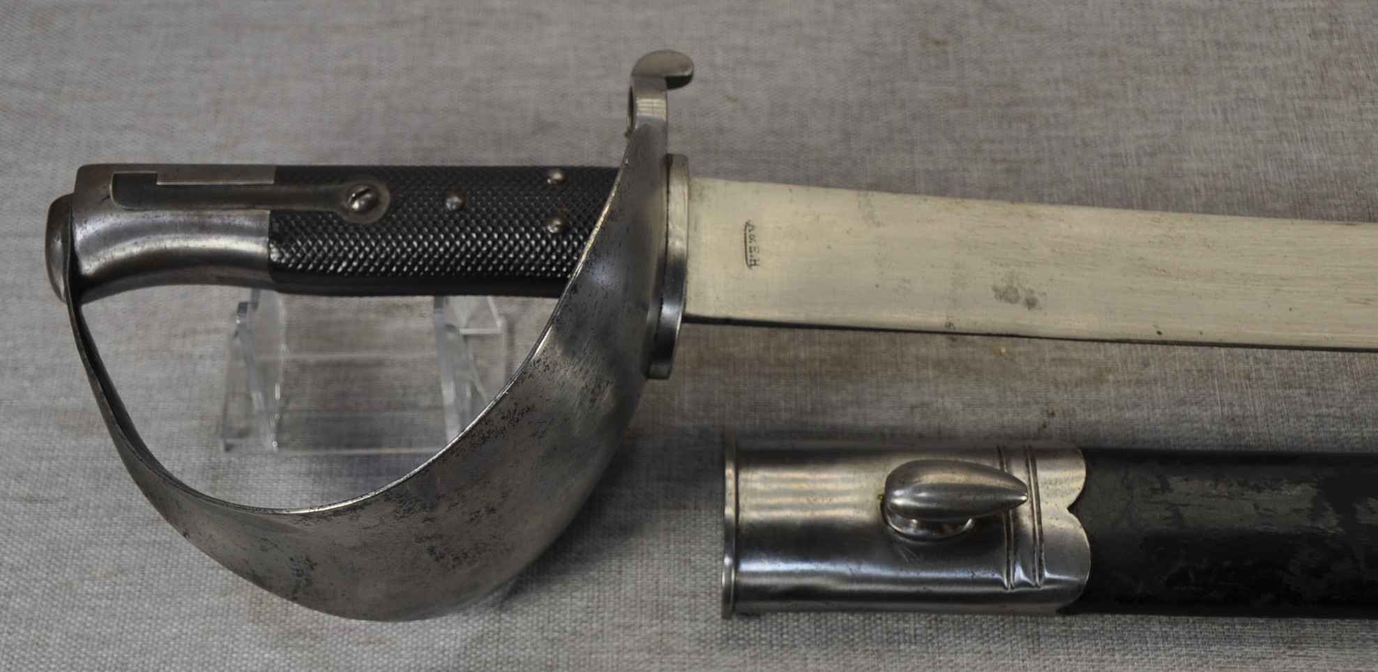 British Pattern 1859 Cutlass bayonet with leather grips bushed for the Martini Henry rifle. Manufactured c1886 by A & E HORSTER, in SOLINGEN, GERMANY. Manufacturers logo to ricasso on one side and the Soligen inspection mark “Crown over S over 14” on the other. Scabbard is black lather with steel locket and chape. Overall length is 826mm, Blade length 680mm and with MR 18mm. Originally part of the John Watts Collection.  Bayonet and scabbard in excellent condition overall. (Reference WW 765 and B&CB B193)