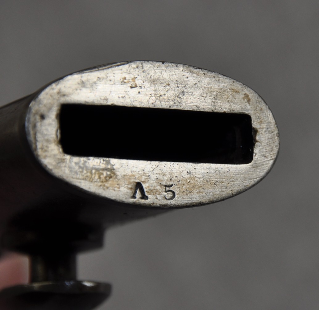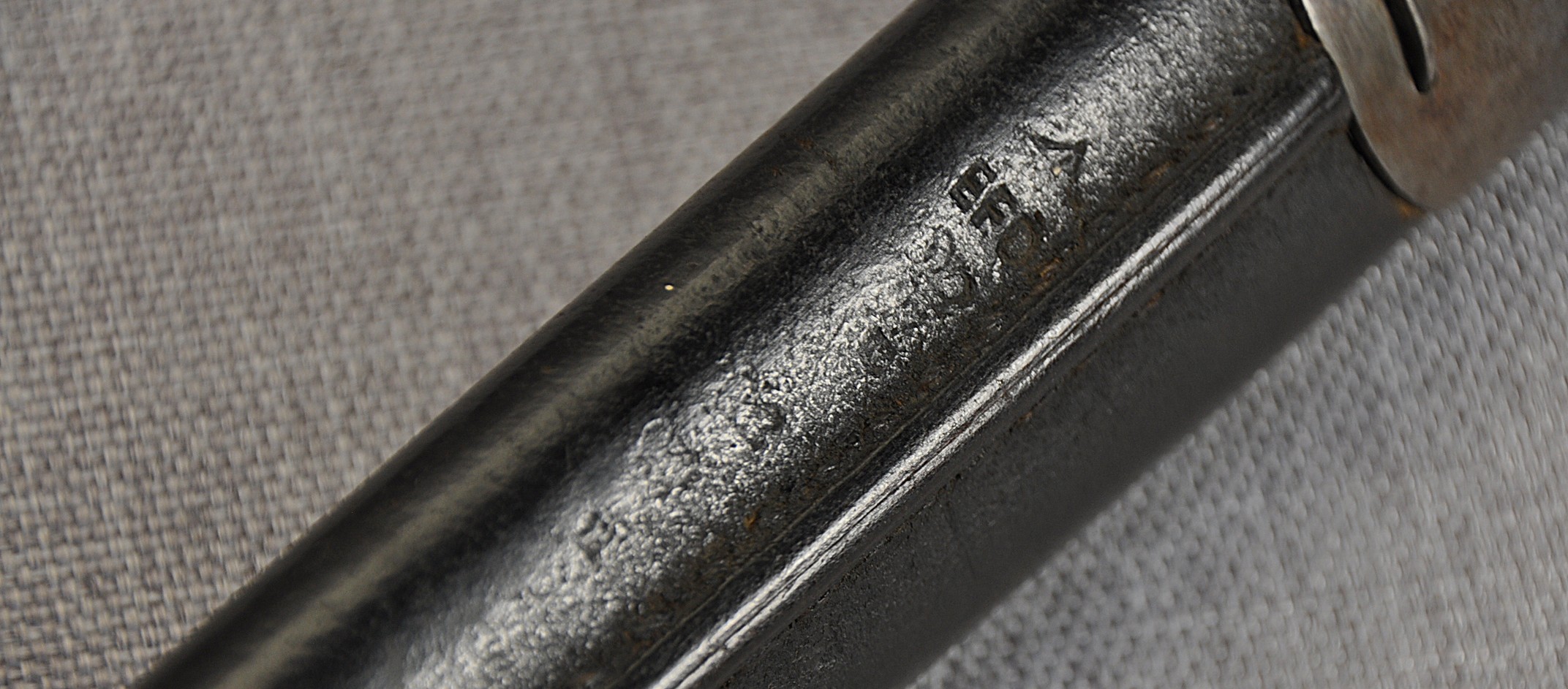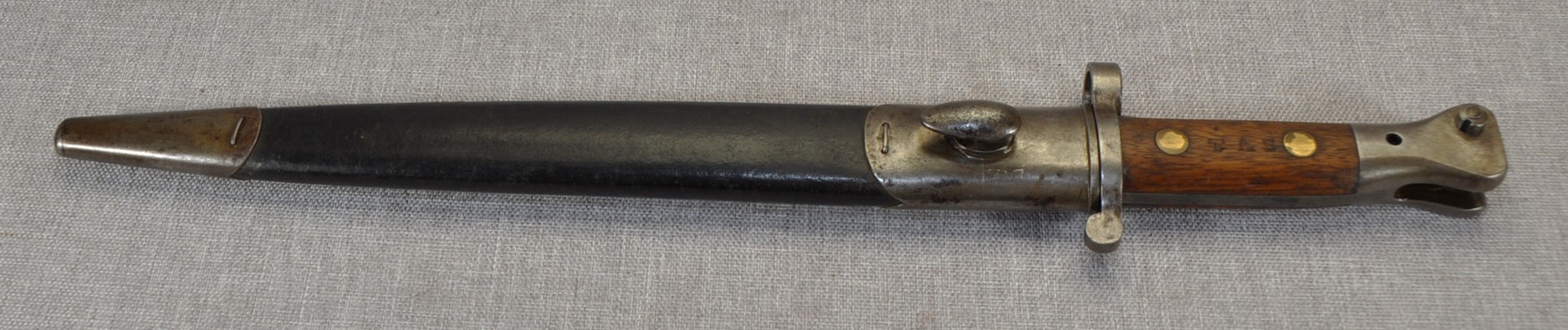 Pattern 1888 scabbard has Enfield proof mark, acceptance mark and two inspectors marks stamped in the leather. There is a “V” and a “5” stamped to the mouth of the scabbard locket. Both bayonet and scabbard in very good condition.