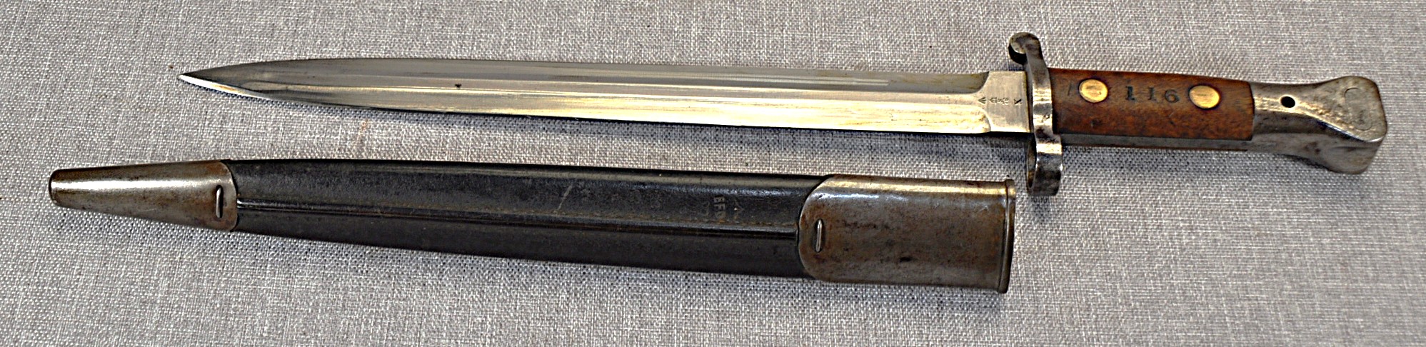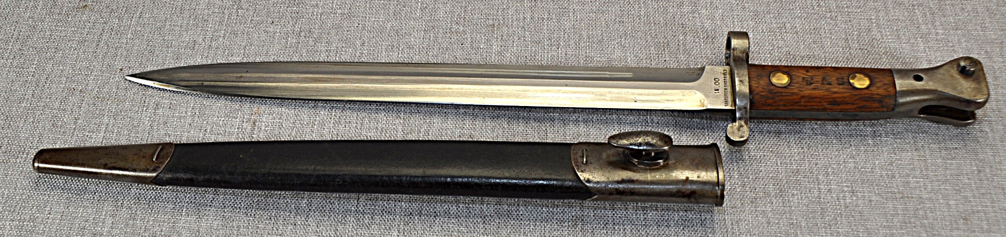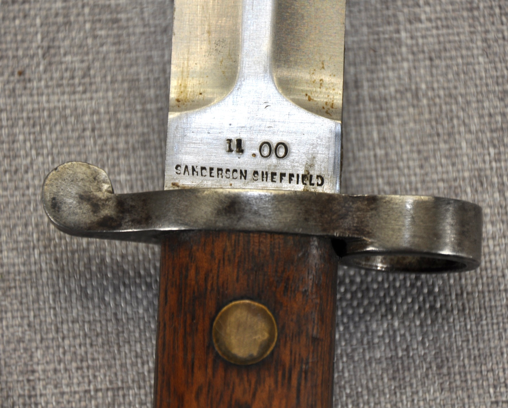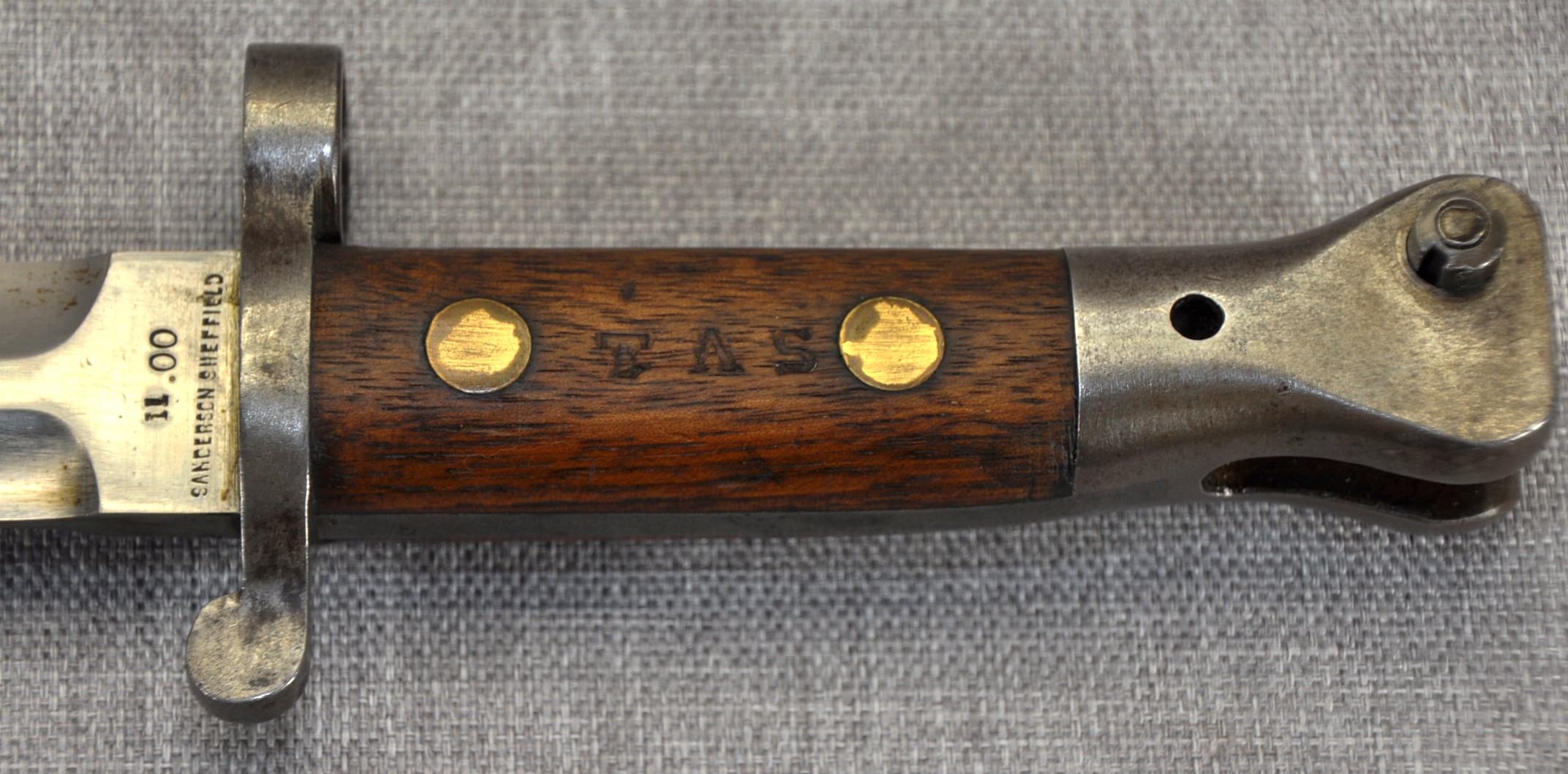 British Pattern 1888 Model II manufactured by Sanderson in Sheffield. Manufactured/issued November 1900 (11 ’00). Ricasso has acceptance mark, inspection mark and the bend test mark. Wood grips are secured by brass rivits and stamped “TAS” on one side and “116” on the other.