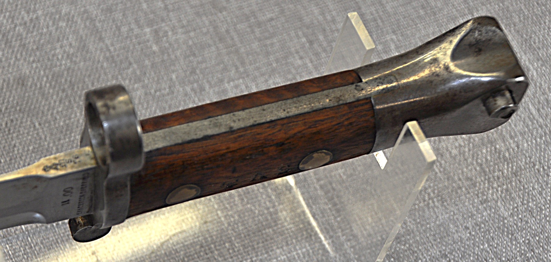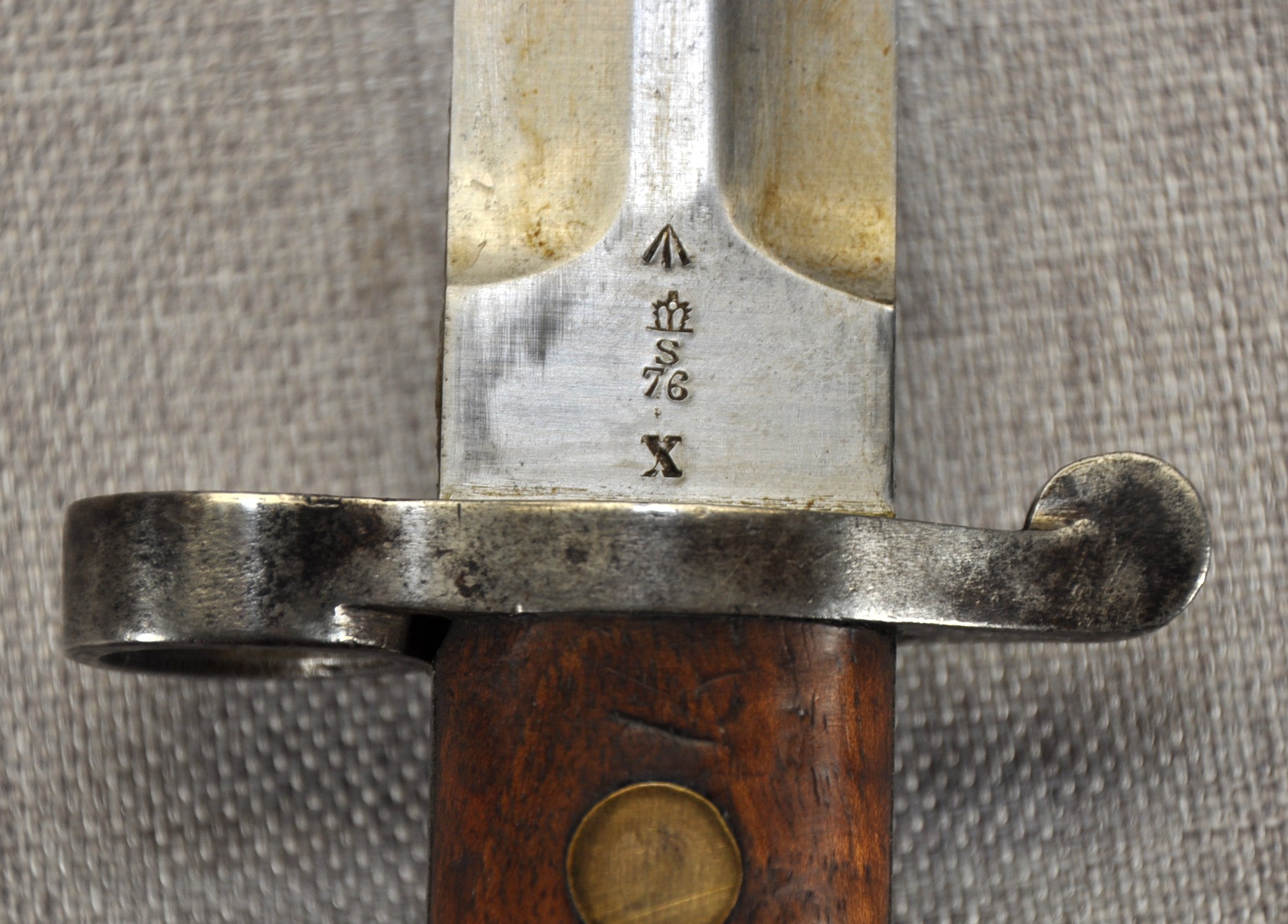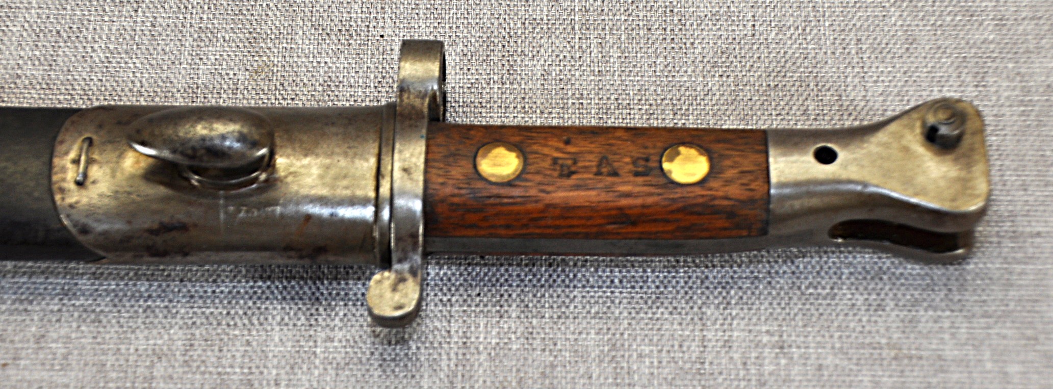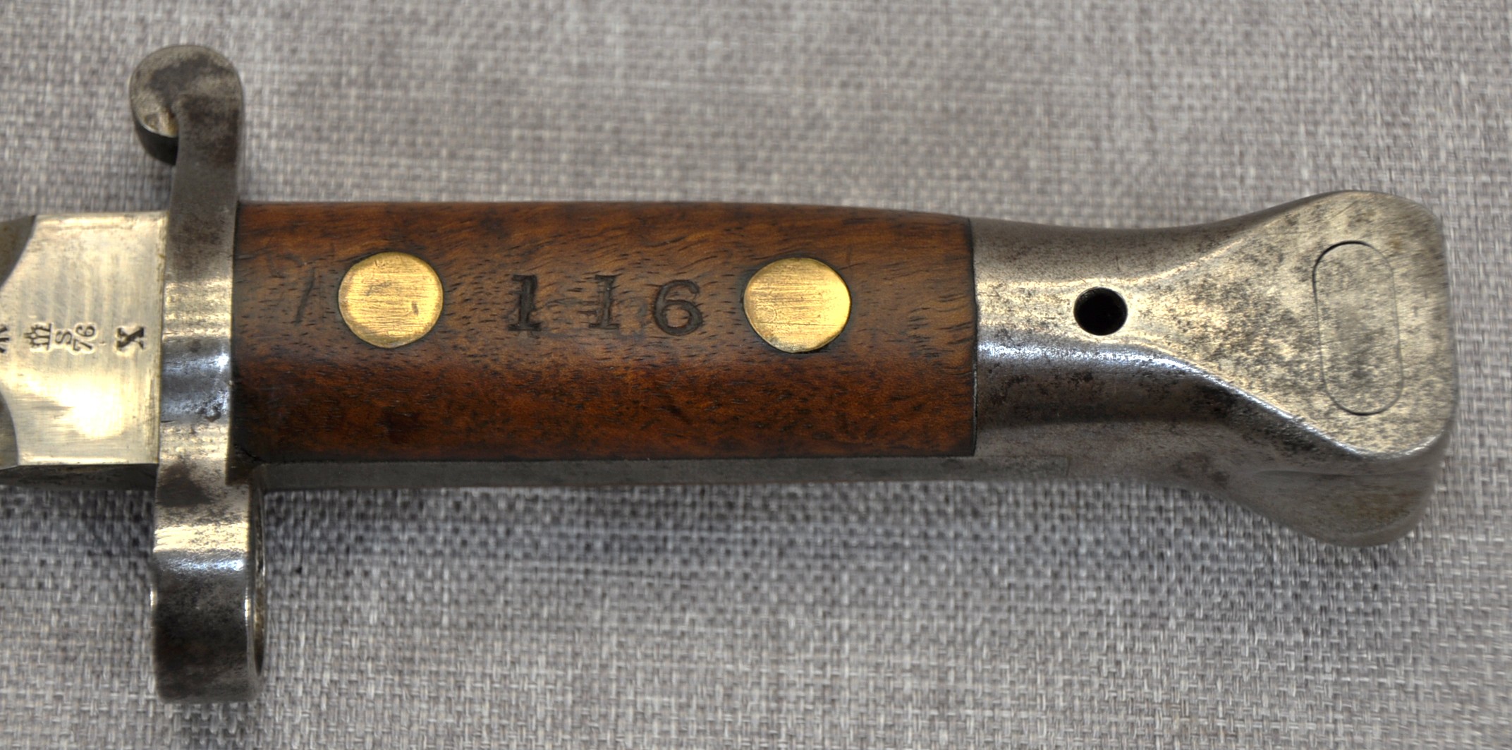 British Pattern 1888 Model II manufactured by Sanderson in Sheffield. Manufactured/issued November 1900 (11 ’00). Ricasso has acceptance mark, inspection mark and the bend test mark. Wood grips are secured by brass rivits and stamped “TAS” on one side and “116” on the other.