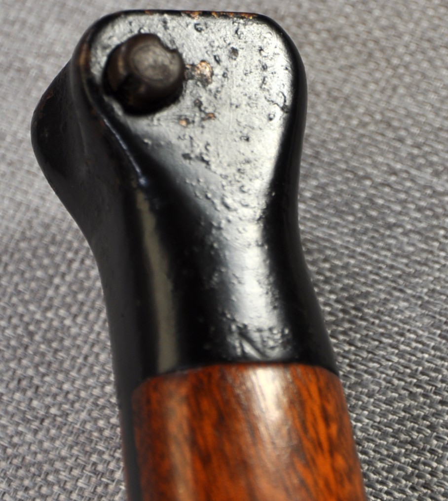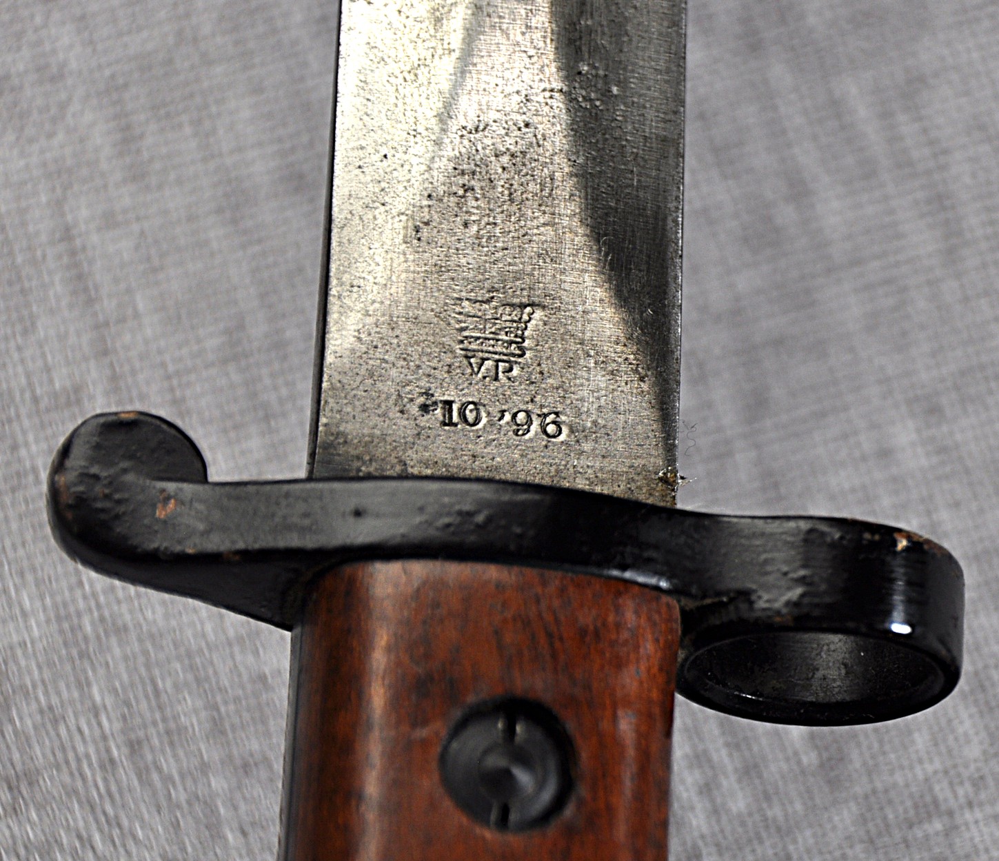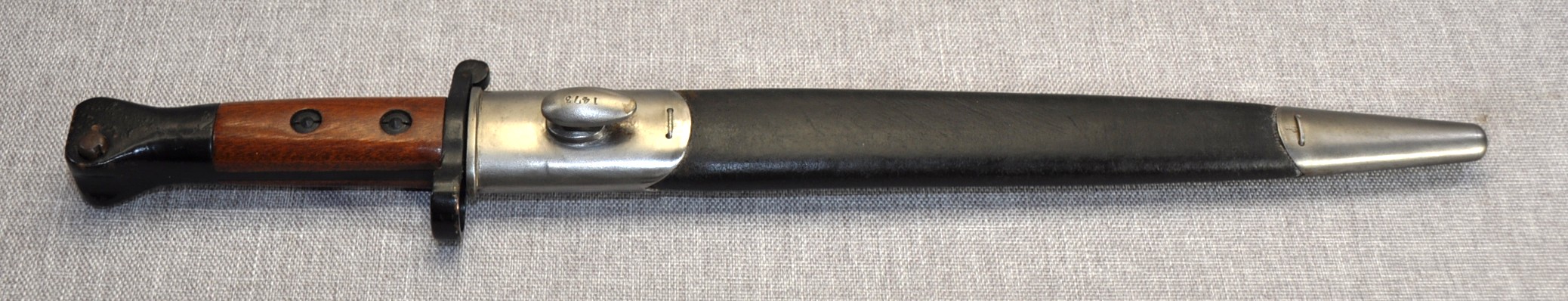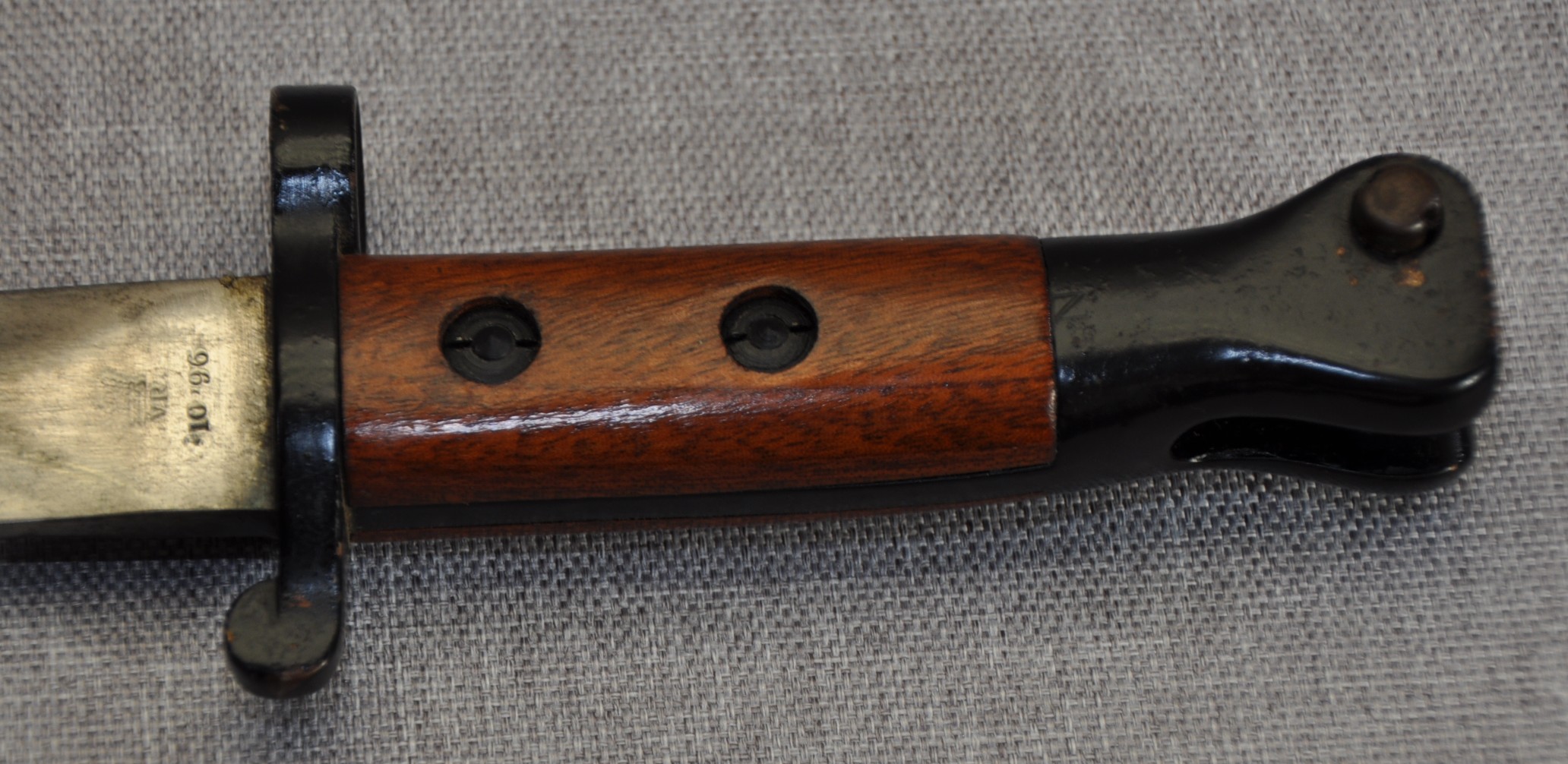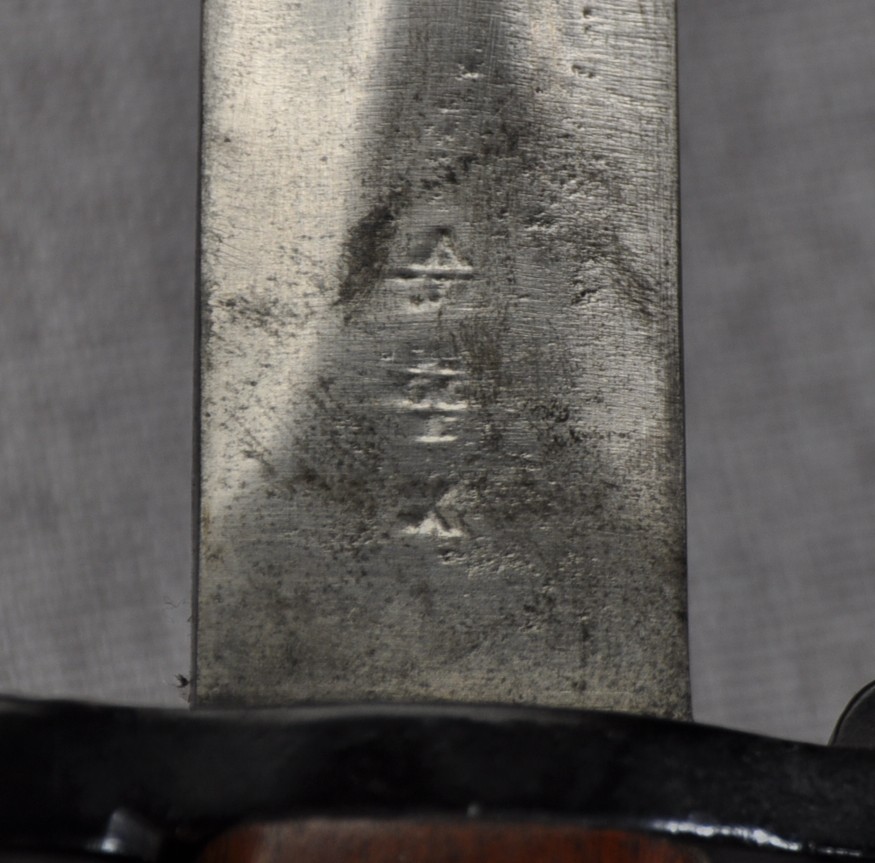 British Pattern 1888 Model III. Imprints of the inspection marks/proofs can be faintly seen on the ricasso but the maker is unknown. Manufactured/issued  October 1896 (10 ’96). Pommel,tang and crossguard finished in gloss black. Grips are secured by screw bolts as per the model III and they are very ornate in both timber and finish. The bayonet has an “N” stamped to the pommel for Navy. Bayonet could be a naval finish or for an officer or both.