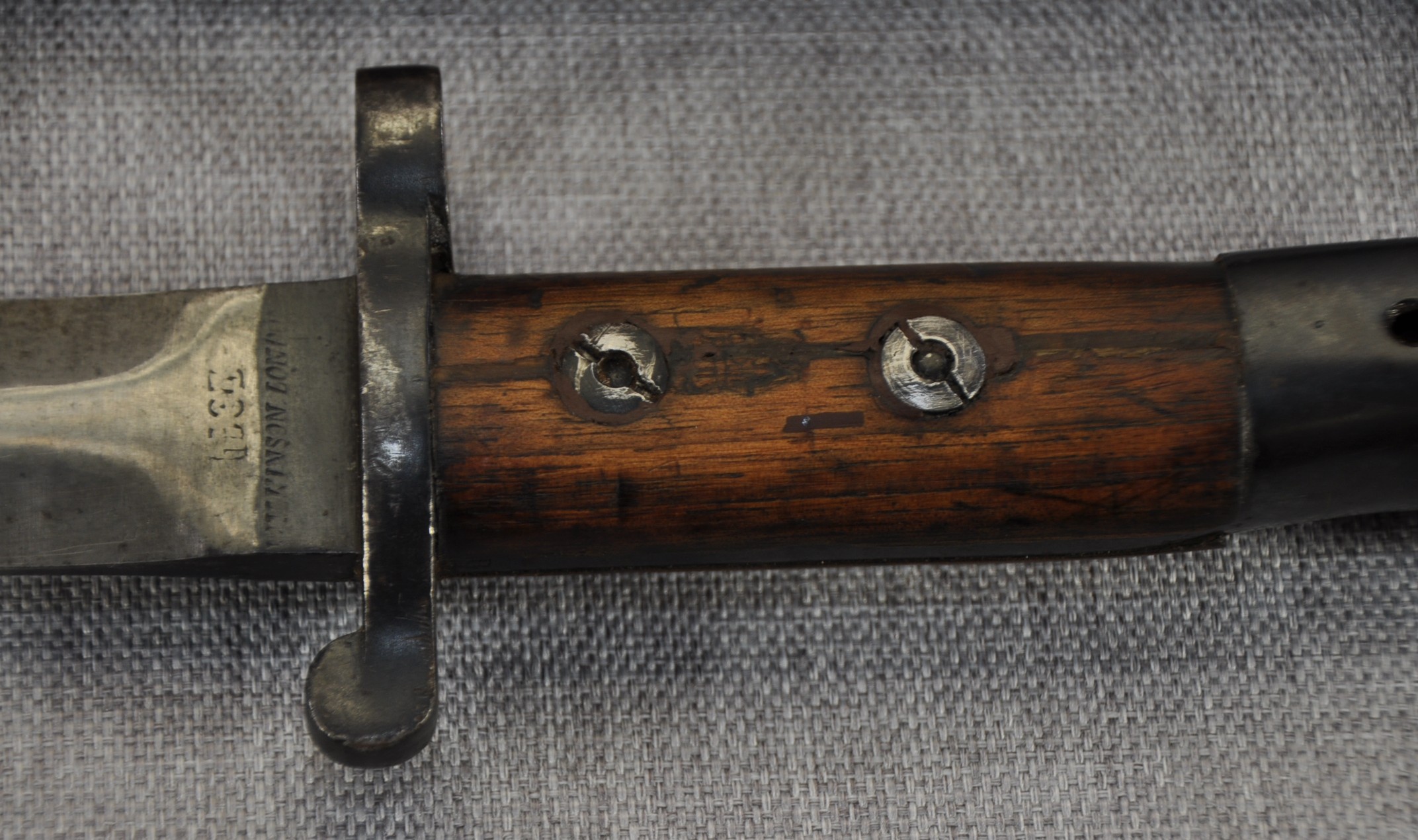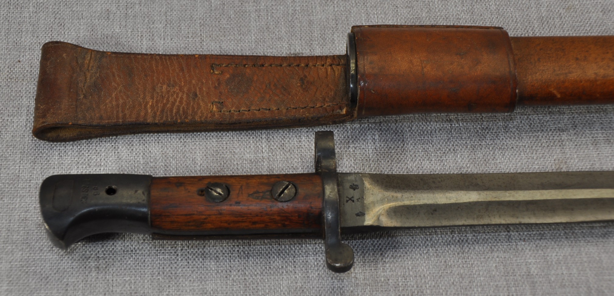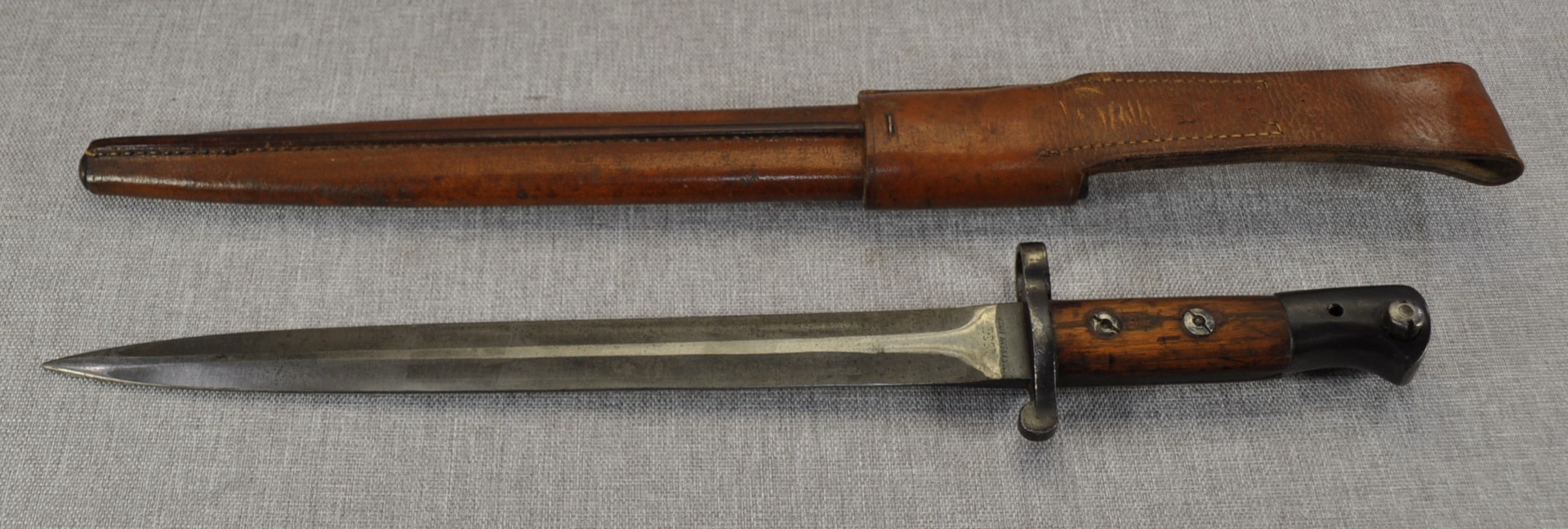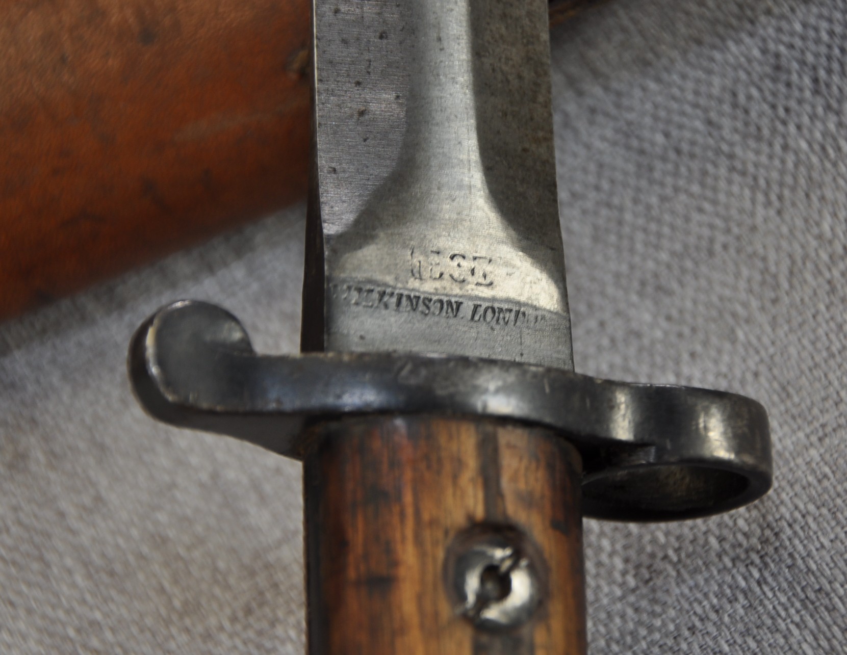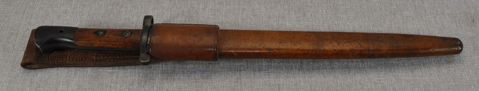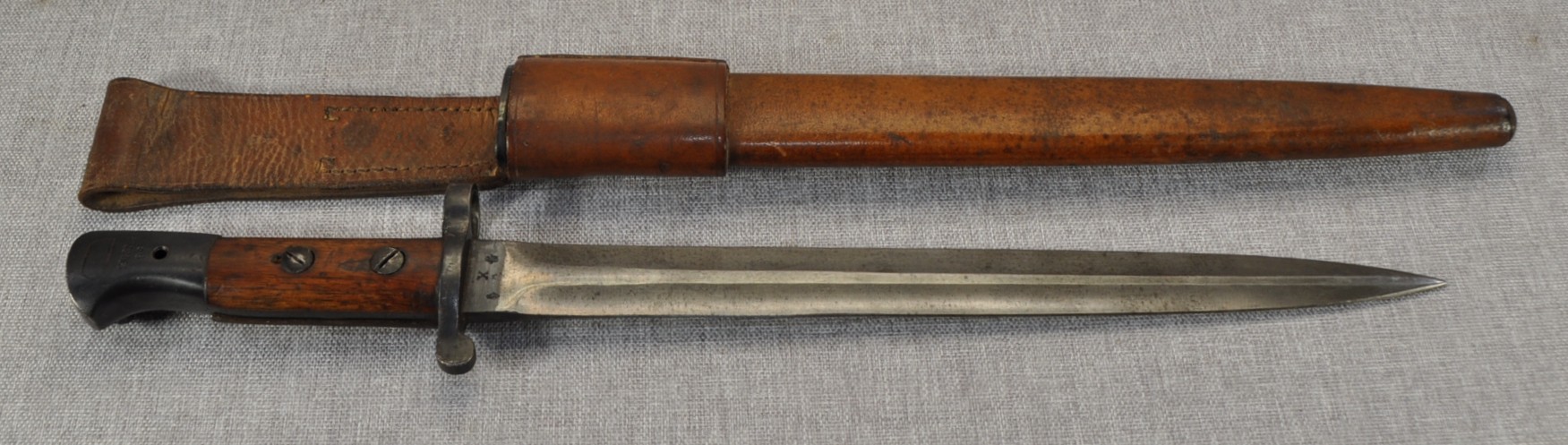 British Pattern 1903 sword bayonet manufactured by Wilkinson Sword Company, London. Manufactured/issued 1904 as per scabbard but as the bayonet markings suggest this is a P1888 converted with the model dates to the ricasso overstamped. Ricasso has Wilkinson, London on one side and Wilkinson inspection mark, Bend test mark and Indian inspection mark on the other. Wood grips are secured by screw bolts and with overproud grips and filled extra hole indicate a P1888 conversion.