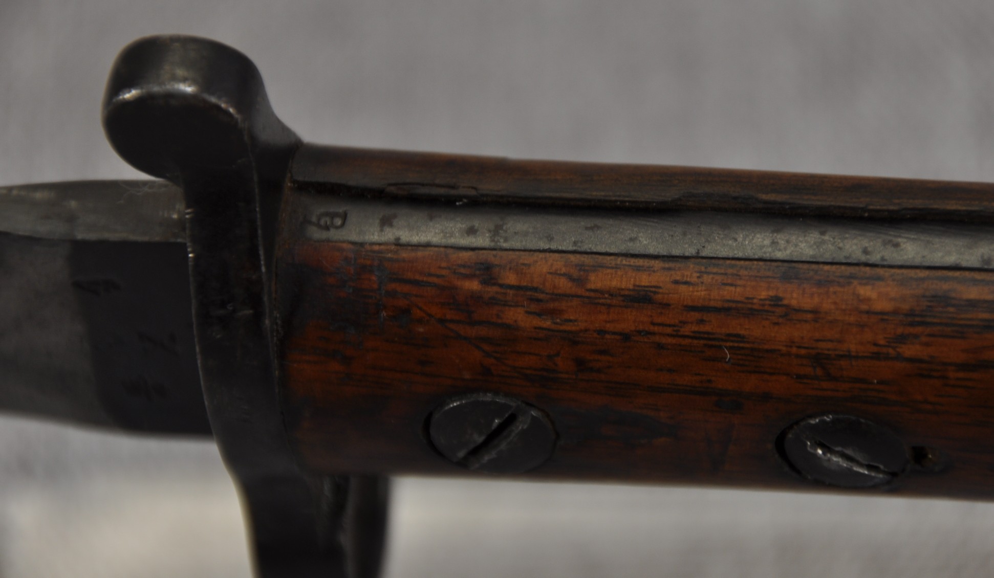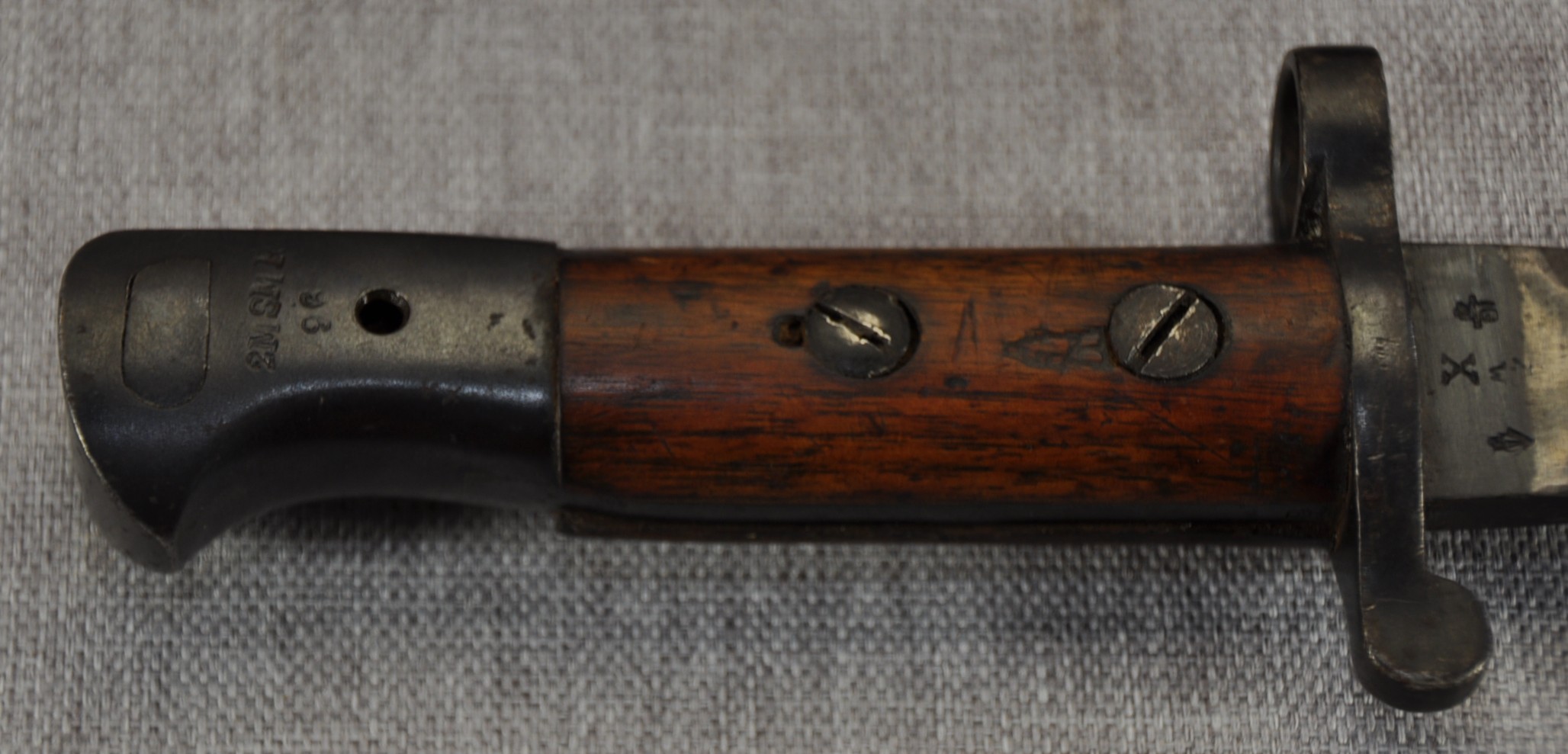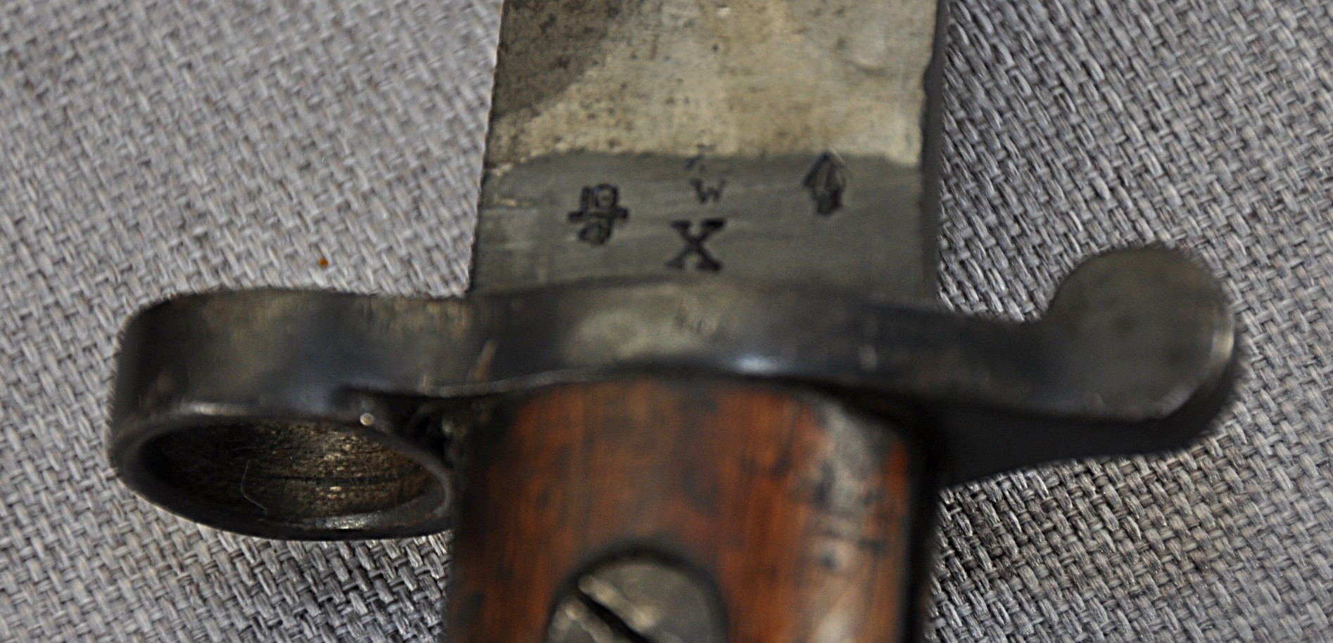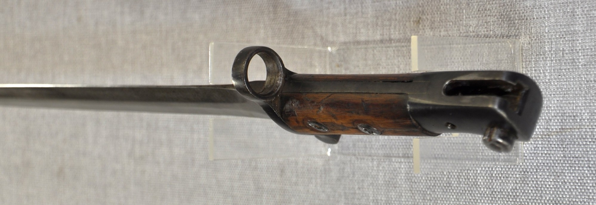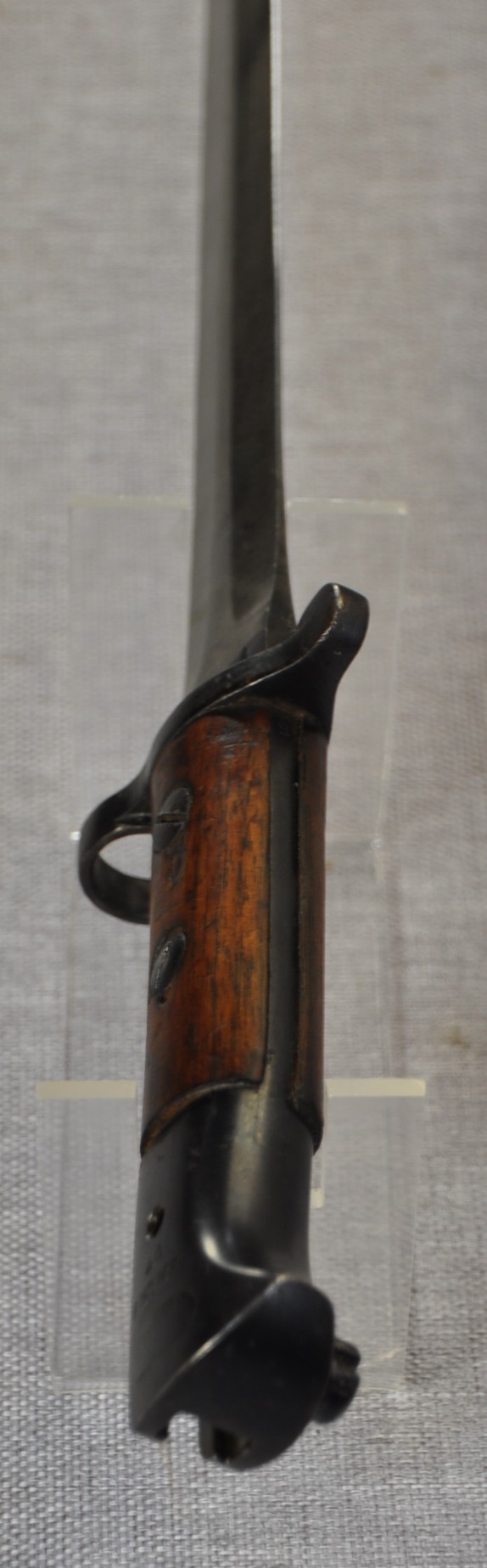 British Pattern 1903 sword bayonet manufactured by Wilkinson Sword Company, London. Manufactured/issued 1904 as per scabbard but as the bayonet markings suggest this is a P1888 converted with the model dates to the ricasso overstamped. Ricasso has Wilkinson, London on one side and Wilkinson inspection mark, Bend test mark and Indian inspection mark on the other. Wood grips are secured by screw bolts and with overproud grips and filled extra hole indicate a P1888 conversion.