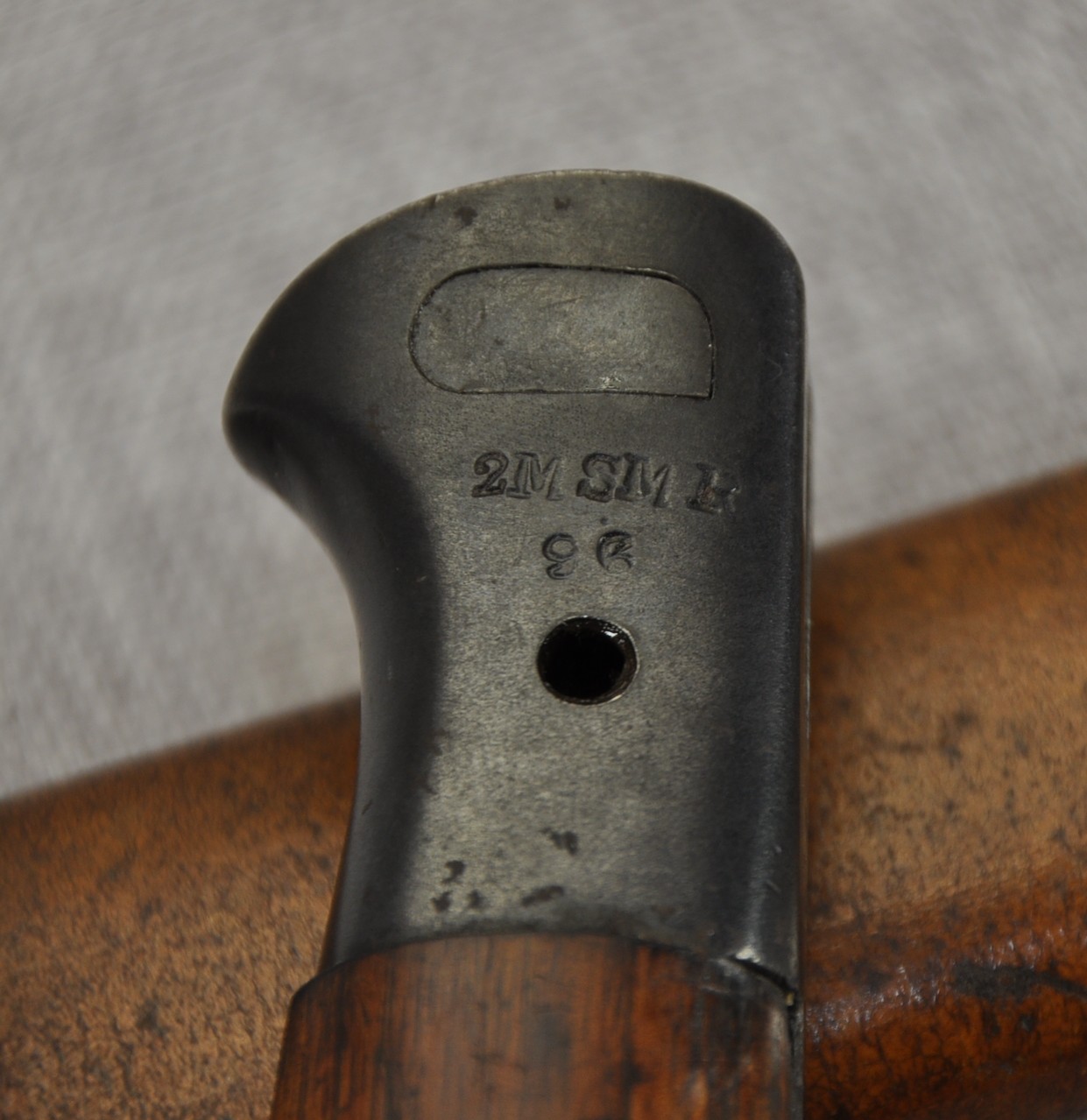 There is a batch number “B” to the underside of the tang. Pommel is regimentally marked/stamped “2M SM R over 96”. Blade length 303mm and overall 423mm.