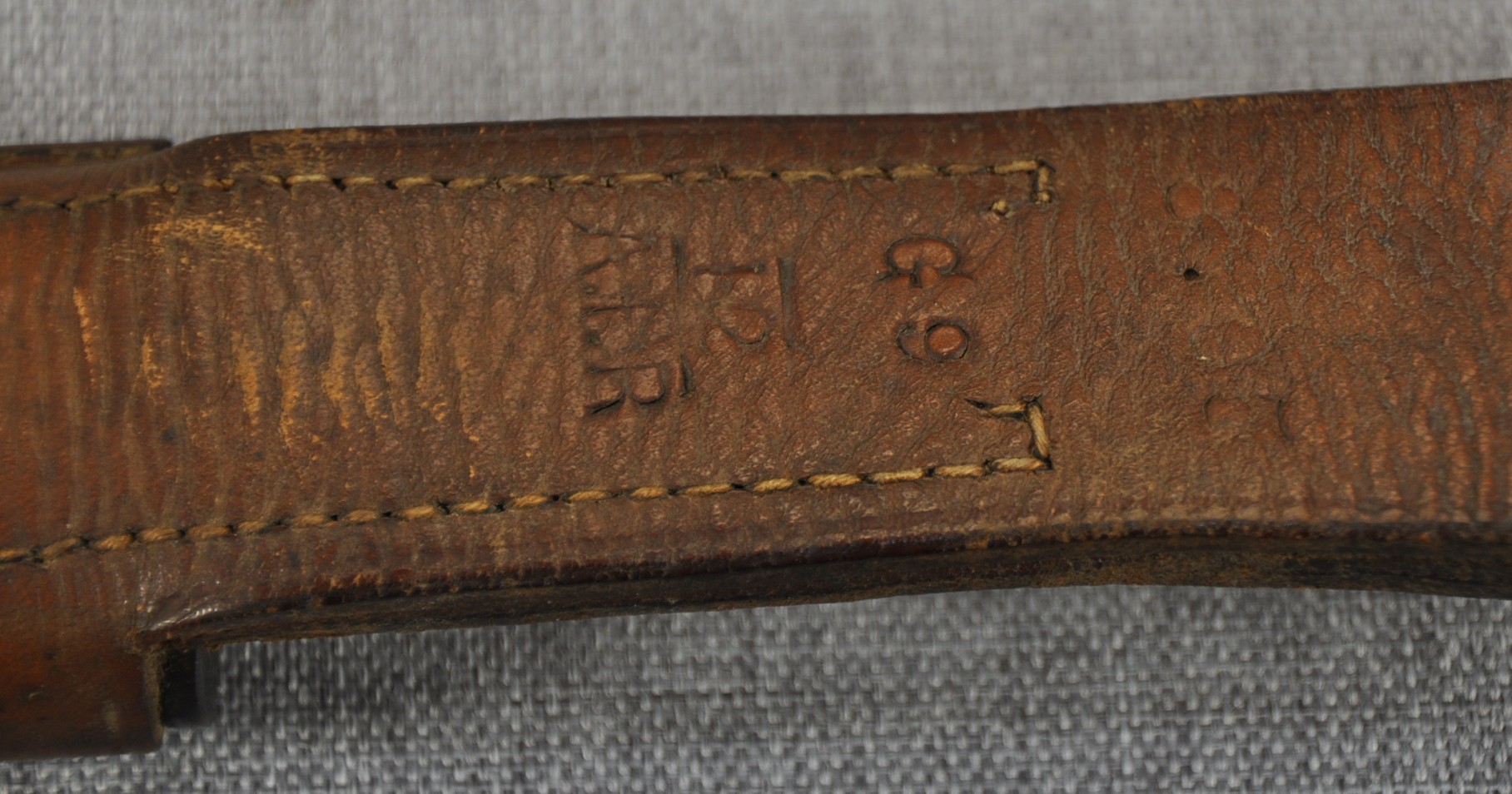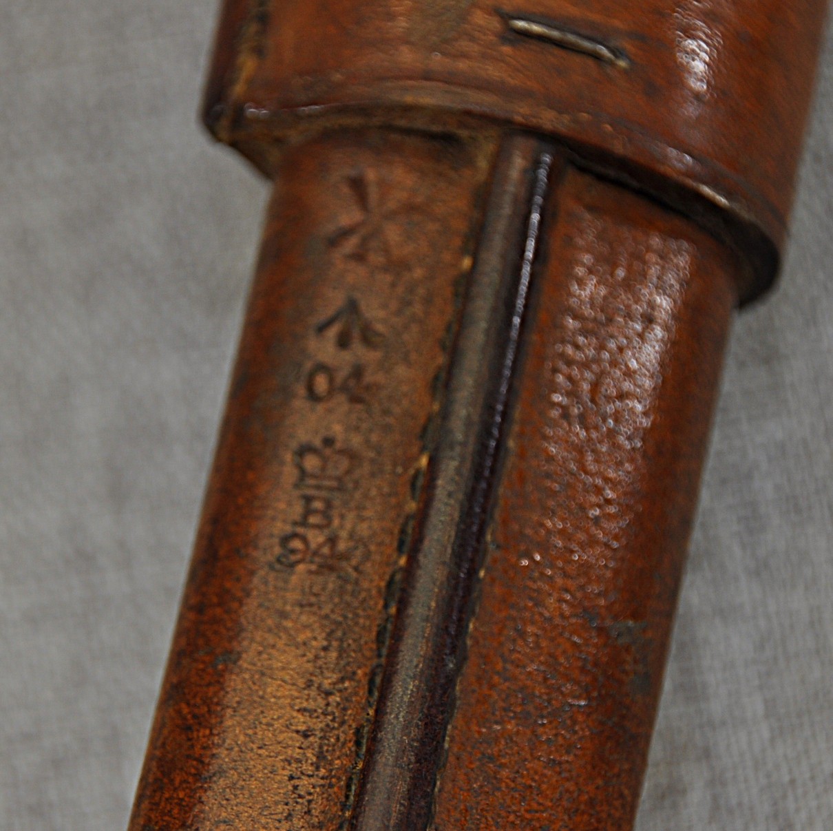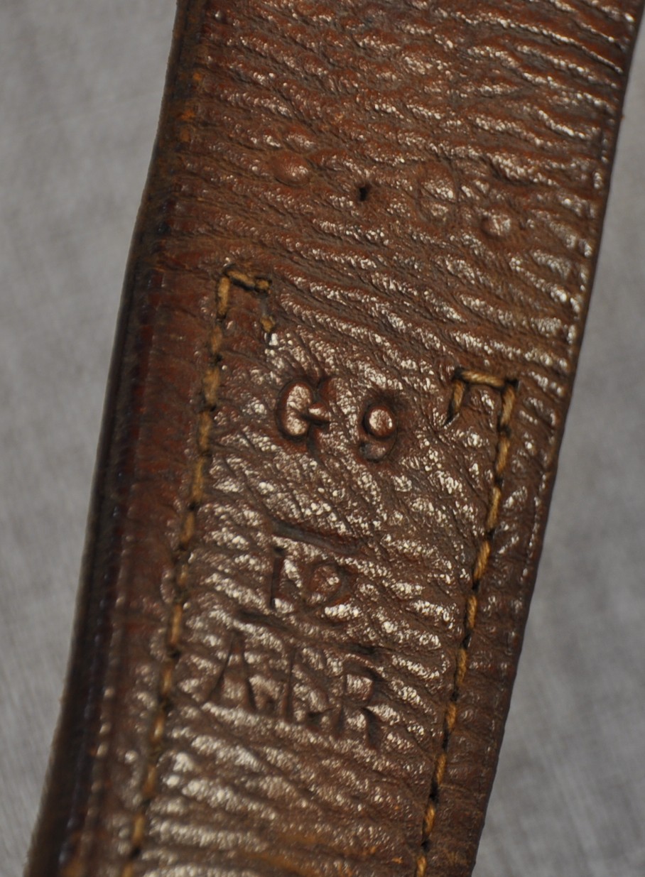 Pattern 1903 scabbard has Enfield/Birmingham proof mark, acceptance mark and an issue date of 1904 “04” stamped in the leather. The steel locket mouth has two small broad arrow stamps. Rear of the scabbard belt is stamped “8.05 over G9 over 12/AIR” indicating G Company 12th Battalion Australian Infantary Regiment of Tasmania. Both bayonet and scabbard are in very good condition.