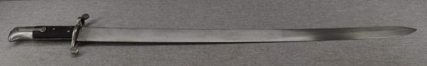 British Volunteer Naval sword bayonet most likely converted from Pattern 1859 cutlass bayonet. Retains the straight blade and is 686mm long with MR being 20.5mm. German contract blade with partial “Crown” stamp, possibly being ERFURT. No scabbard. (Reference WW 771 and BCB B167)