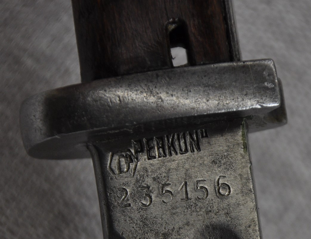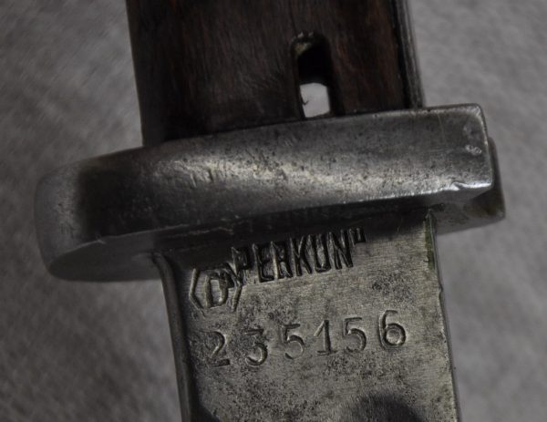 Polish WZ24 (Model 1924) Mauser bayonet. Made under German occupation without muzzle ring but with the flashguard by Perkun. Serial number 235156 stamped to the ricasso with a “D” inside a hexagon. Other side of ricasso is marked with the Polish Eagle over W.P. (Polish Army) (Reference WW 541, Jn160/3 and K #131)